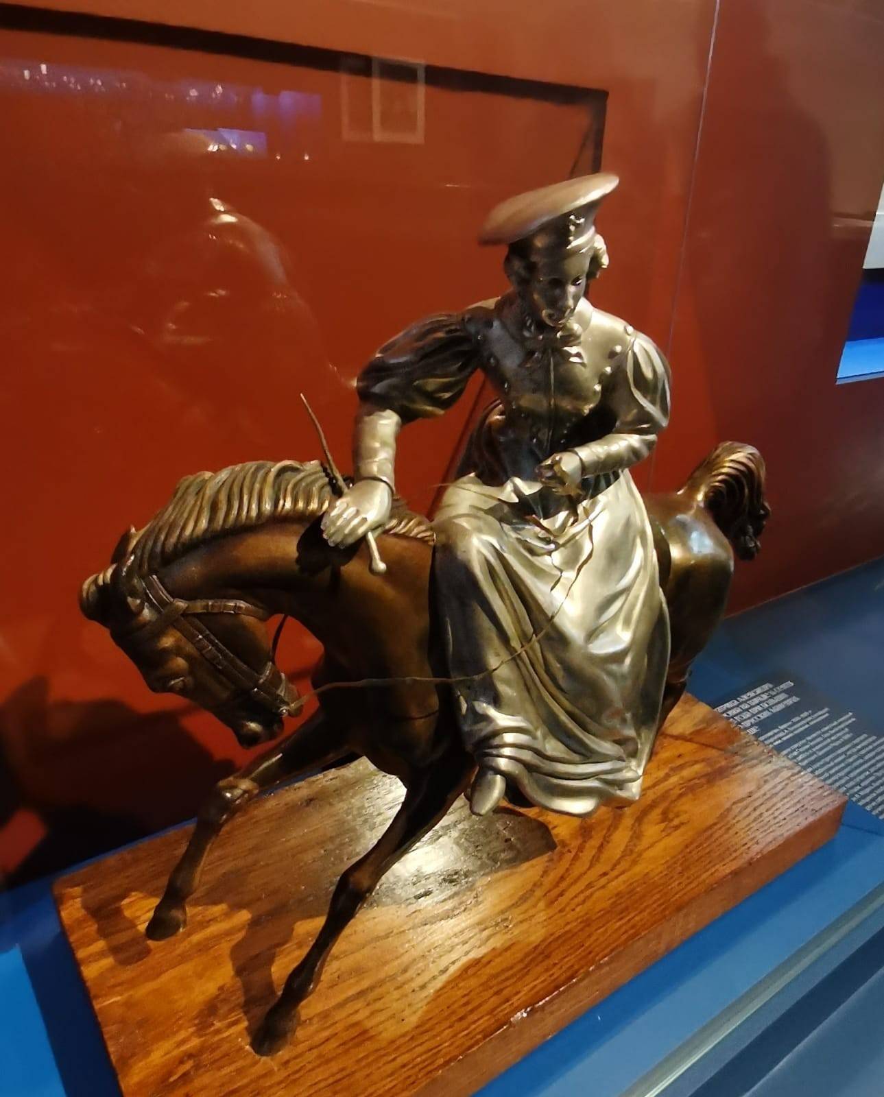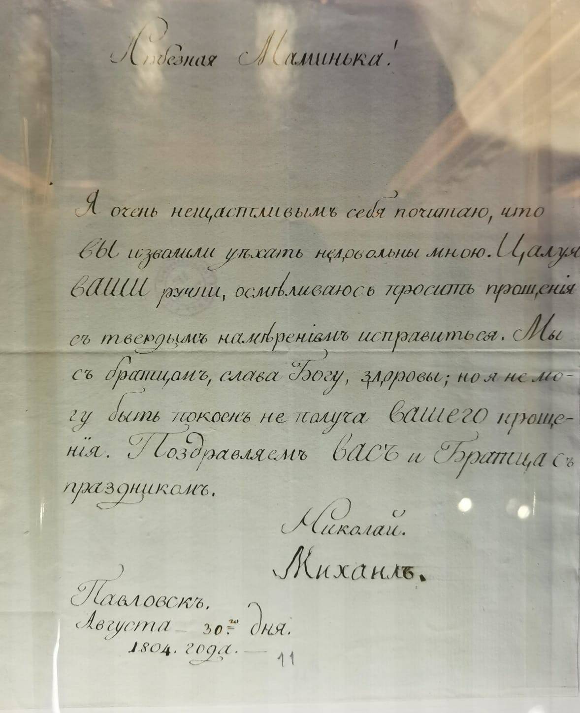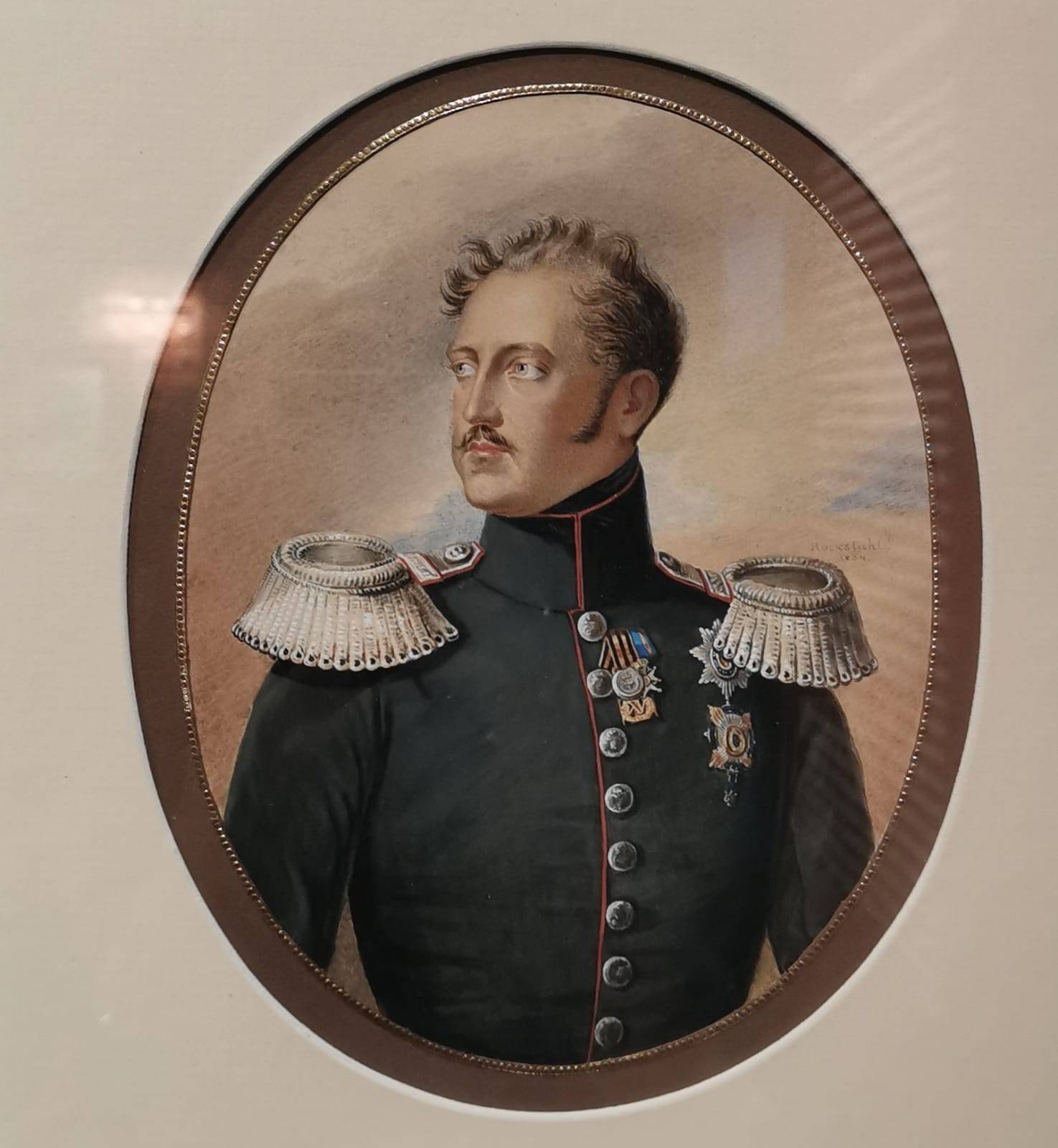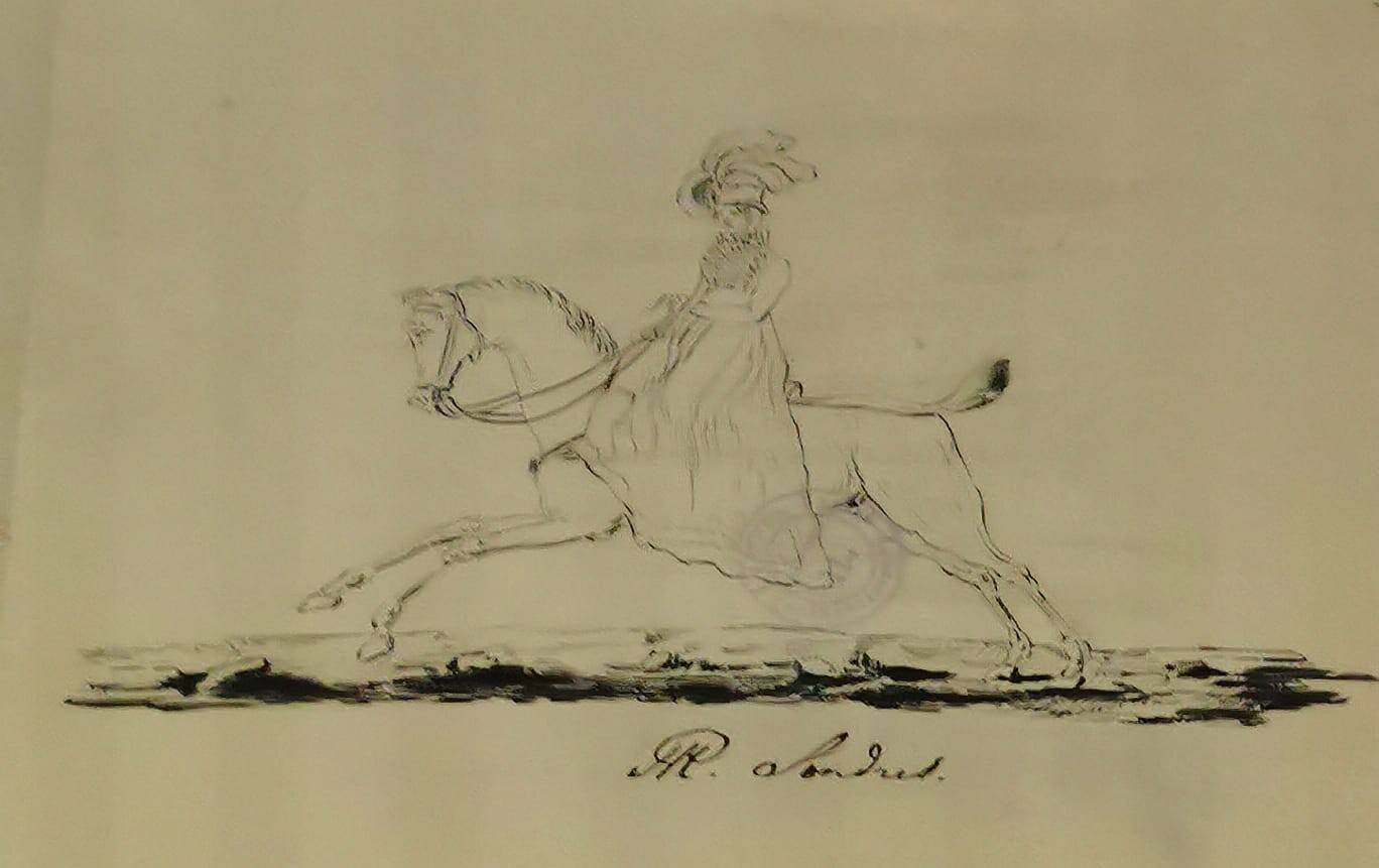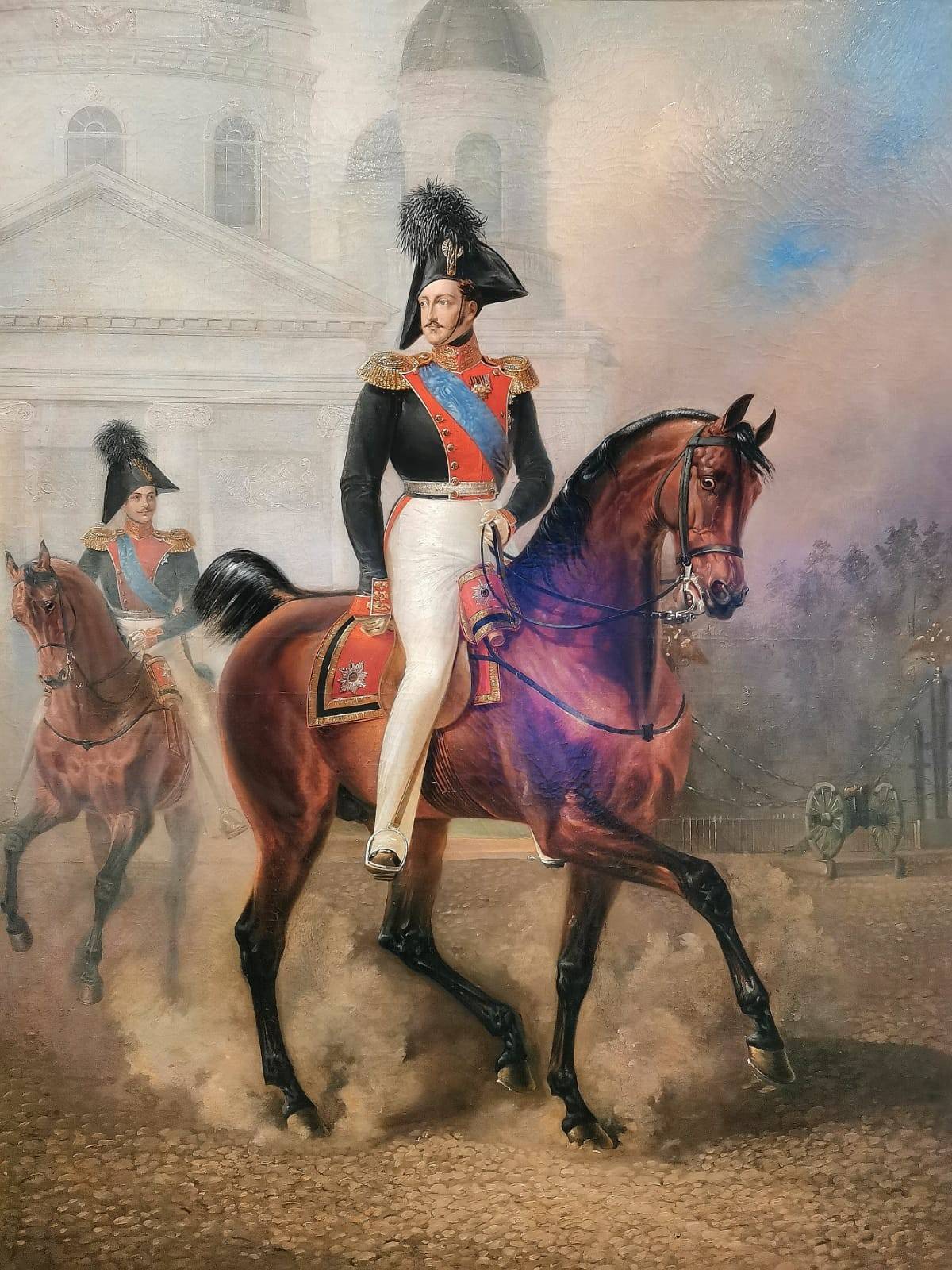 Нас встречают портреты его родителей – неказистого, курносого, но при этом - благородного Павла I и цветущей пышки Марии Фёдоровны. Отца своего Николай почти не знал – тот мало занимался младшими сыновьями, да и на момент страшного цареубийства, произошедшего в Михайловском замке, Николаю было пять лет. Зато маменька оказала серьёзное влияние на своего любимчика Николашу. На одной из выставочных витрин – письмо к матери, где он просит прощения за ненадлежащие поступки. Малыш был егозой и хулиганом, но обладал цепким умом и несгибаемой волей. Вот – ученические тетради, в том числе по истории. Удивителен стройный почерк мальчика – в те годы каллиграфические буквицы весьма ценились, но не все их достигали. Такая манера писать – знак уверенности и аккуратности. Тут же – чертежи и рисунки Николая. Он имел недурные способности к художеству, но не стал их развивать. Забавен автопортрет в профиль – царевич явно относился к себе с юмором. Динамична «Дама на лошади» - движение передано с невероятной точностью. Этот рисунок Николай сделал в Англии во время своего путешествия. К слову, тогда все дружно решили, что русский царевич – самый красивый принц Европы. Изображения 1810-х годов являют милого юношу, более напоминающего поэта-романтика, чем не технаря-военного. На одном из портретов, сделанном Орестом Кипренским, мы видим застенчивого молодого человека, ещё не знающего своей судьбы.