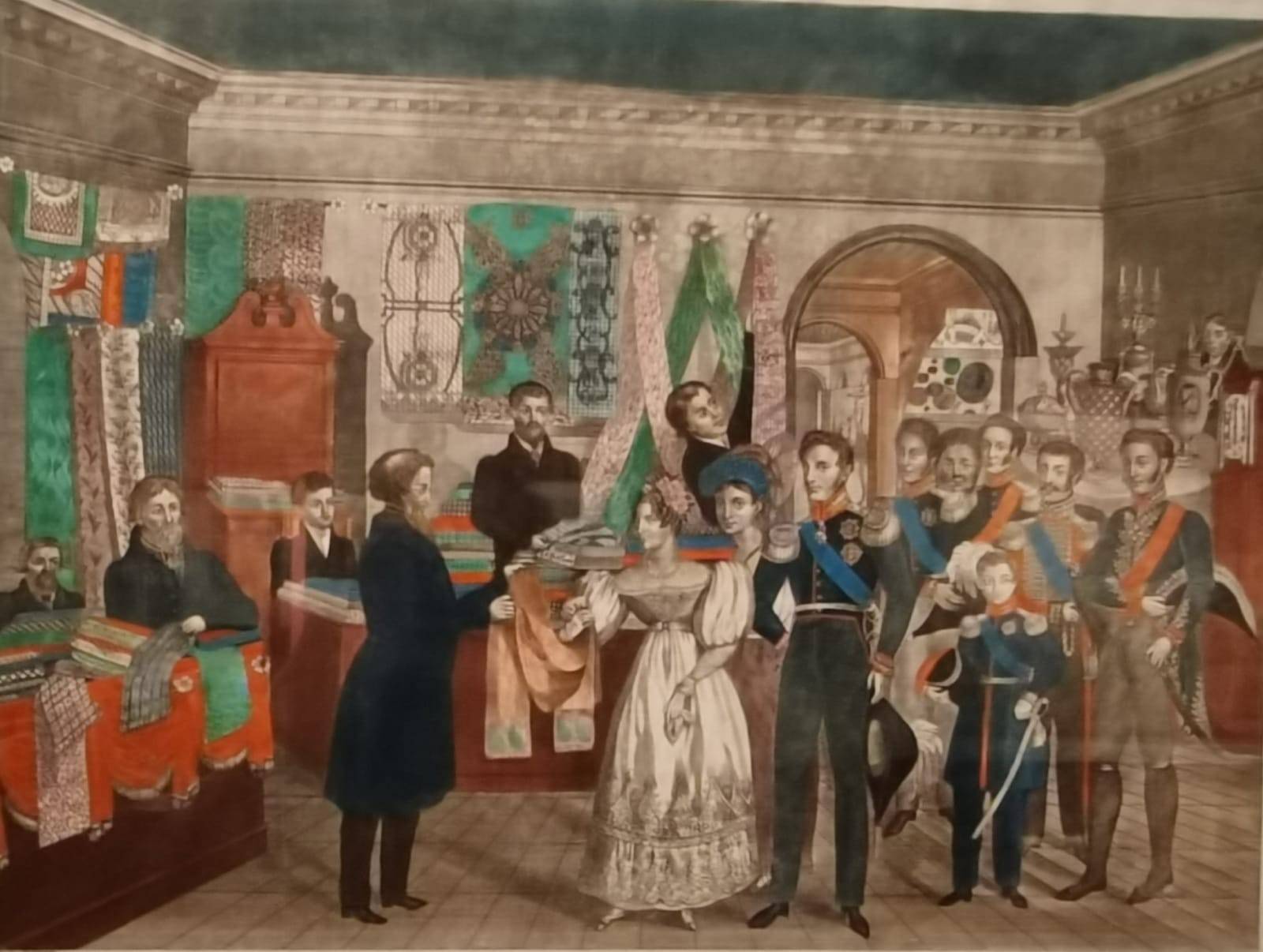 Николай не брезговал общением с купцами, по праву считая их дельными людьми. В XIX веке по мере роста буржуазного влияния стали проводиться выставки достижений – как национальные, так и международные. Вот – почти лубочная картинка, отображающая визит государя на один из таких московских смотров. Купечество предъявляет свои ткани, которые ничуть не хуже аглицких. Николай I вообще стремился к тому, чтобы Россия меньше зависела от импорта, а заодно от иностранного влияния на умы.
