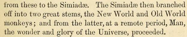 Прямым текстом о происхождении человека именно от обезьян Старого Света Ч. Дарвин пишет в конце главы: «The Simiadae then branched off into two great stems, the New World and Old World monkeys; and from the latter, at a remote period, Man, the wonder and glory of the Universe, proceeded» [7, с. 213].