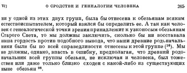 Русский перевод по второму изданию 1874 г. (перевод под редакцией И. М. Сеченова): «А так как человек с генеалогической точки зрения принадлежит к узконосым обезьянам Старого Света, то мы должны заключить, сколько бы ни восставала наша гордость против подобного выводА, что наши древние родоначальники были бы по всей справедливости отнесены к этой группе. Мы не должны, однако, впасть в ошибку, предполагая, что древний родоначальник всей группы обезьян, не исключая и человека, был тождествен или даже только близко сходен с какой-либо из существующих ныне обезьян» [8, с. 265].