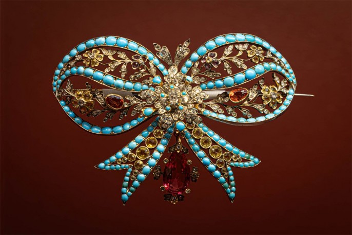 Когда-то принаряженные красотки дополняли свои облачения букетами, составленными из блестящих каменьев. Корсажный букетик притягивал взоры – иногда нескромные, ибо эти сверкающие соцветья располагались рядом с декольте. На выставке имеются и такие экземпляры. Вот – умопомрачительный букетик, в котором идеально звучат серебро, золото, бриллиант, алмазы, изумруд, бирюза и – немного стекла. Какую прелестницу он радовал? Сколько заплатил за эту феерию супруг? Это важно только дотошным историкам. Нам же – пиршество для глаз.
