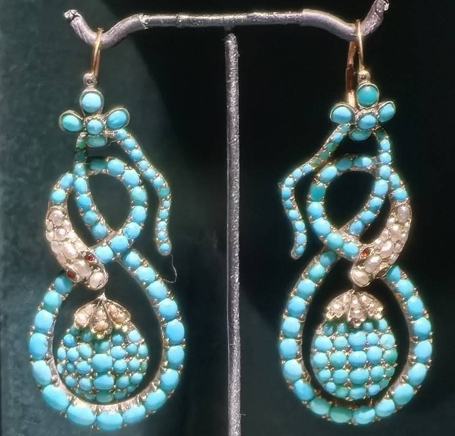 Бирюза – совсем иные флюиды. Она и простовата, и надменна – смотря, как её подать. Бывает она и опасной. «Девушке нельзя дарить бирюзы, потому что бирюза, по понятиям персов, есть кости людей, умерших от любви, а замужним дамам нельзя дарить аметиста», - говорится у Николая Лескова в рассказе «Жемчужное ожерелье». Тем не менее, бирюза слыла «девичьим» камешком, так как идеально сочеталась со свежестью барышень. Перед нами – бирюзовые браслеты, броши – в виде цветов и птиц, длинные серьги. А если всё это в сочетании с голубыми глазами, которые тогда встречались чаще, нежели теперь? «Казалося, для нежной страсти / Она родилась. А глаза… / Ну, что такое бирюза?» - вопрошал Михаил Лермонтов, расписывая тамбовскую казначейшу.