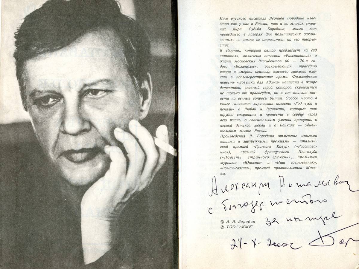 В «Москве» я бывал всё чаще. После истории с книгой Болдыревых с Леонидом Ивановичем некоторое время не пересекался, хотя «Ловушка для Адама» была прочитана. Однажды я вошел с этой книгой в его просторный редакторский кабинет и после делового разговора попросил автограф. Л.И. Бородин подписал: «Александру Витальевичу с благодарностью за интерес. 24-Х-2002».
