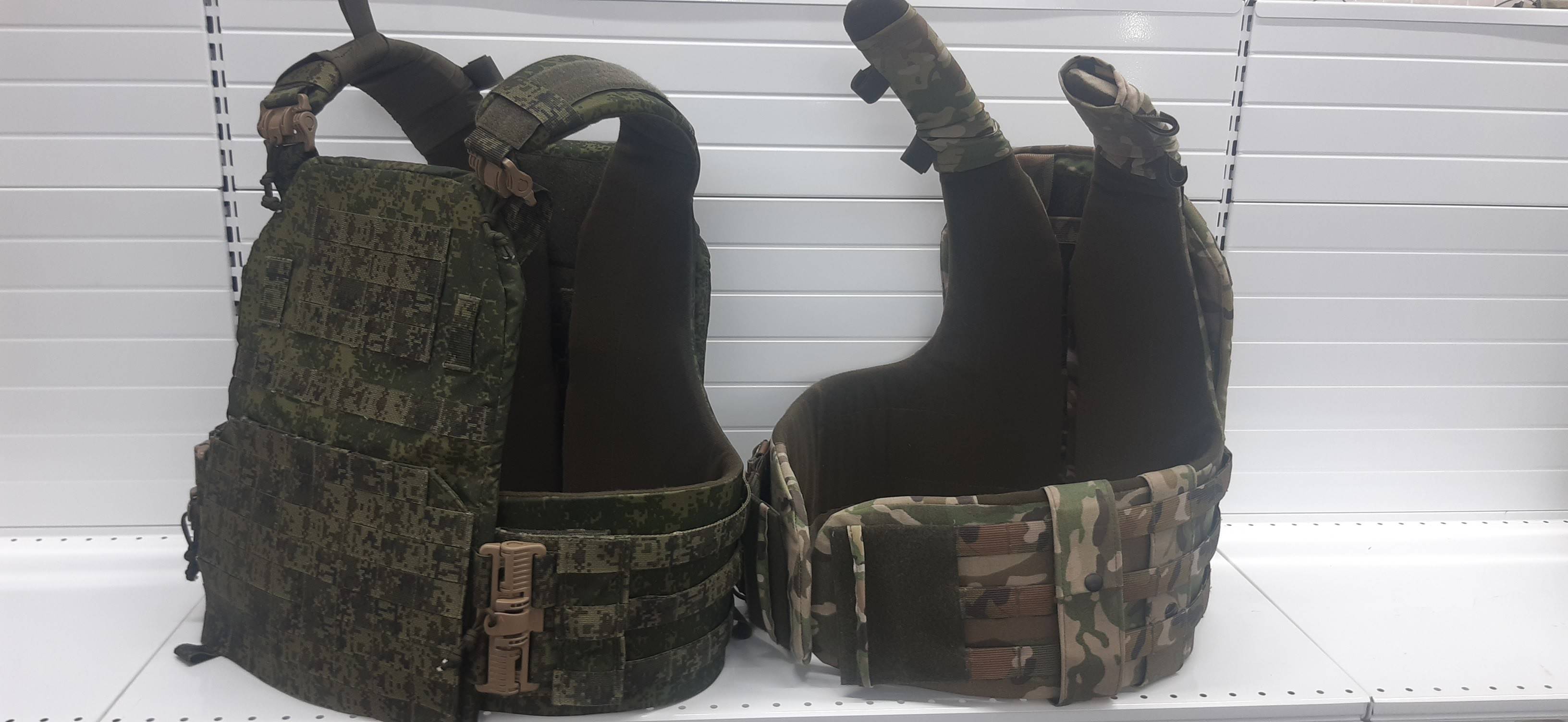 На одной из стен ангара длинная рейка с саморезами, на которых развешаны комплекты кроя бронежилетов разных систем и размеров. Таковых комплектов, выполненных из линолеума, несколько сотен. На предприятии буквально разбирали на части многие штатные и нестандартные, российские и иностранные бронежилеты и другое снаряжение. Линолеум позволяет быстро имитировать, уточнять нужные размеры, опробовать в самих бронежилетах.