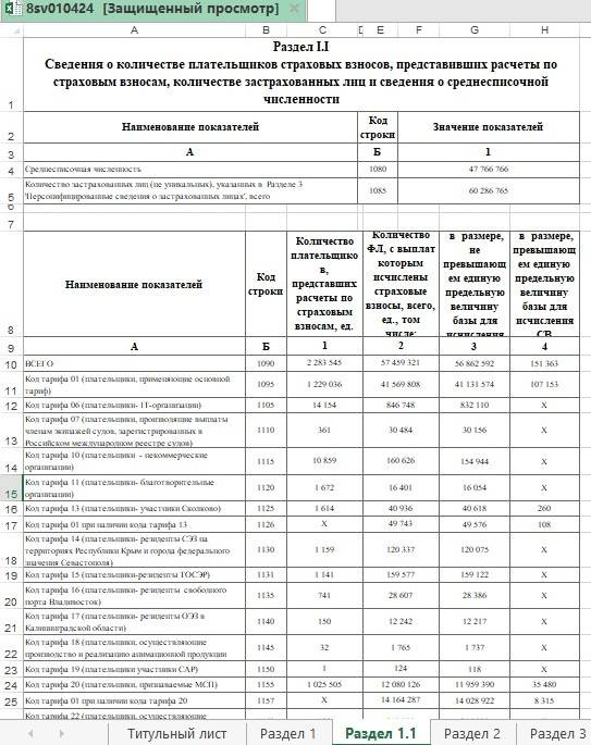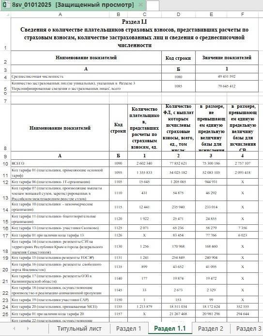 Теперь поставим под сомнение самую большую цифру Росстата по занятости в организациях – 61 млн человек. Для этого воспользуемся данными ФНС из раздела сайта «Данные по формам статистической налоговой отчётности», отчёт 8-СВ «Отчёт о базе исчисления страховых взносов». Если взять оттуда данные только за I квартал 2024 года, то там будет указано 57,5 млн человек, включая 41,6 млн человек из организаций – плательщиков на основном тарифе, плюс 12,1 млн человек плательщиков из числа МСП (малого и среднего бизнеса, в основном ИП и работающих на ИП), ещё есть организации на льготном тарифе с занятыми 3,8 млн человек. Эта же форма, только за весь 2024 год, показывает всего 77,9 млн человек: в организациях на основной ставке взносов – 54 млн человек и в составе МСП – 21,3 млн чел.