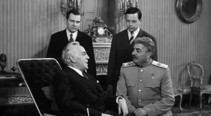 Фото: Юрий Емельянов выступал консультантом во время съёмок фильма «Освобождение» (1968–1971) и даже снялся в роли переводчика Сталина на конференции в Тегеране