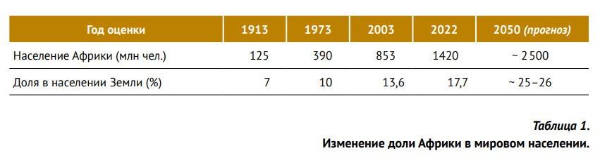 Динамику численности африканского населения можно проследить по таблице 1. Как видно, скоро на Чёрном континенте будет проживать каждый пятый землянин, а к середине столетия — каждый четвёртый. К концу же века, по прогнозам ООН, сделанным несколько лет назад, число африканцев должно приблизиться к 4 миллиардам человек, что составит около 40% глобальной популяции.
