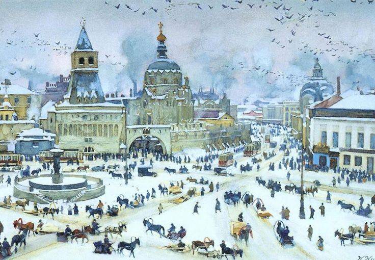 Не забывал художник и родную Москву — искал ракурсы и точки, свет и тень. "Лубянская площадь зимой", "Москворецкий мост", "Кутафья башня", "У Новодевичьего монастыря весной" — всё написано с лёгкостью и шармом. Предпочитал, конечно, старые уголки, не тронутые новациями, хотя — иной раз обращал внимание на тревожащую повседневность. На картине "Тверской бульвар. Ночь" мы наблюдаем эффектные дамские силуэты в шляпах с перьями. Целый выводок блоковских "незнакомок", чья профессия читается столь явно, что это не нужно объяснять взрослым людям. Какие добропорядочные матроны, а тем паче — девушки станут фланировать группками ночью по Тверскому, да ещё в 1900-х годах?