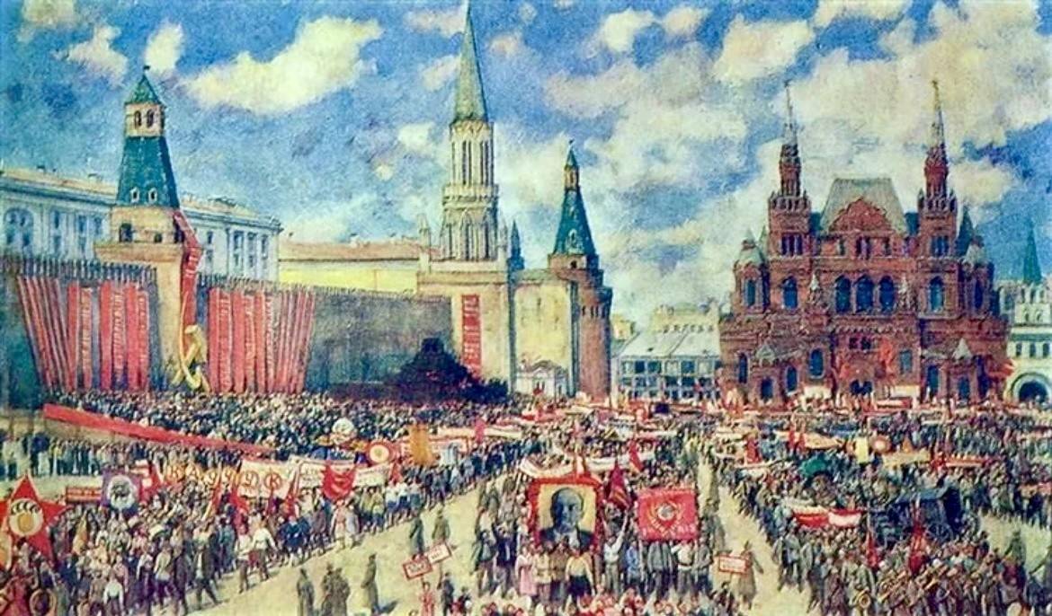 Динамика, смерть и ярость — сирые человечки не знают, как им поступить. Одни — приветствуют алое чудо, простирая к нему руки; иные — бегут прочь, не ведая, куда укрыться. Третьи — умерли, не в силах совладать с горячим дыханием новизны. От этой маленькой — всего 71х101 см — эскизной сиюминутности веет живым и пылким дыханием времени. 1920—1921 годы — столетняя давность, которую не хочется именовать "стариной" — в ней больше движения, чем в нашем столетии.