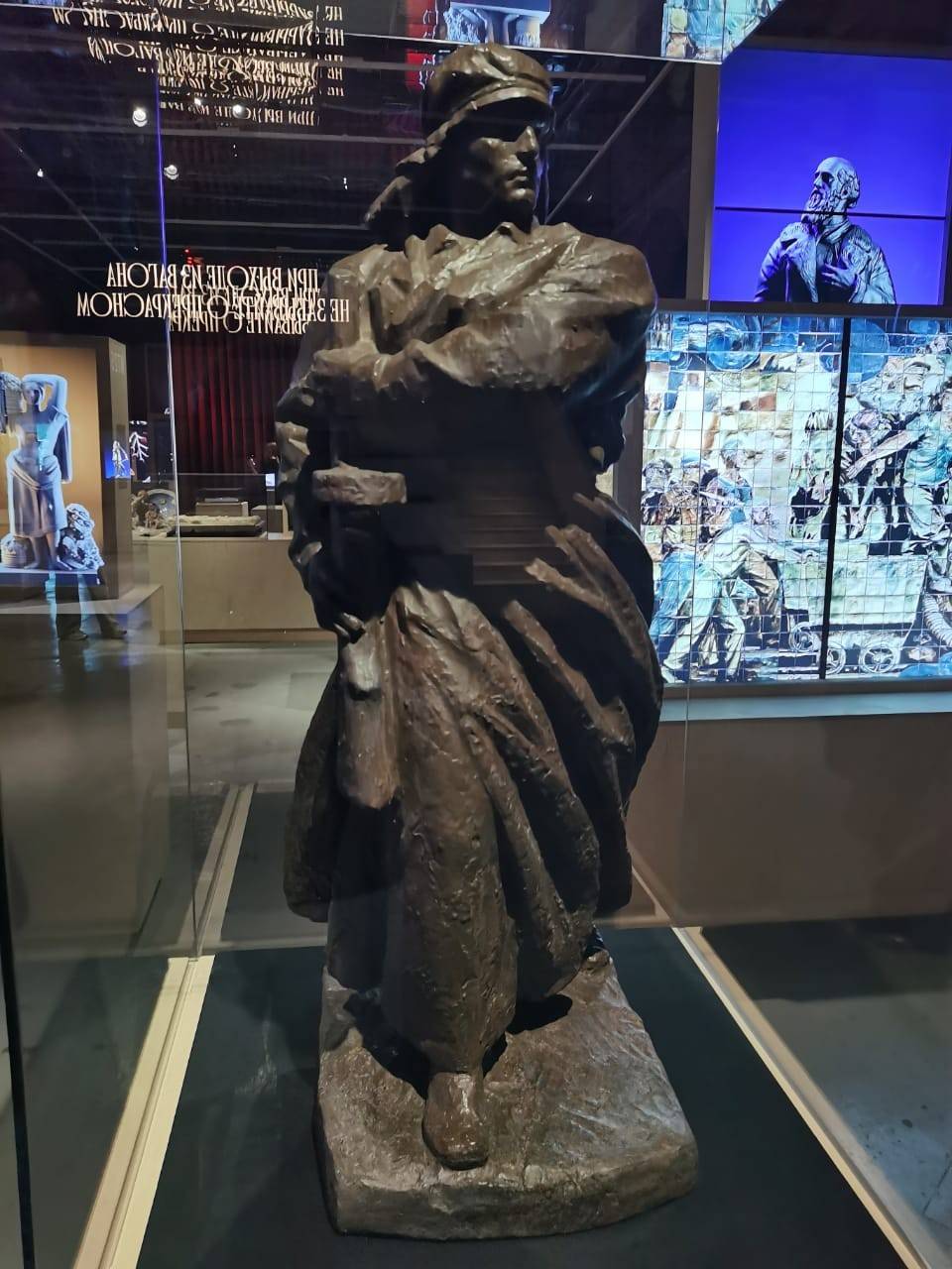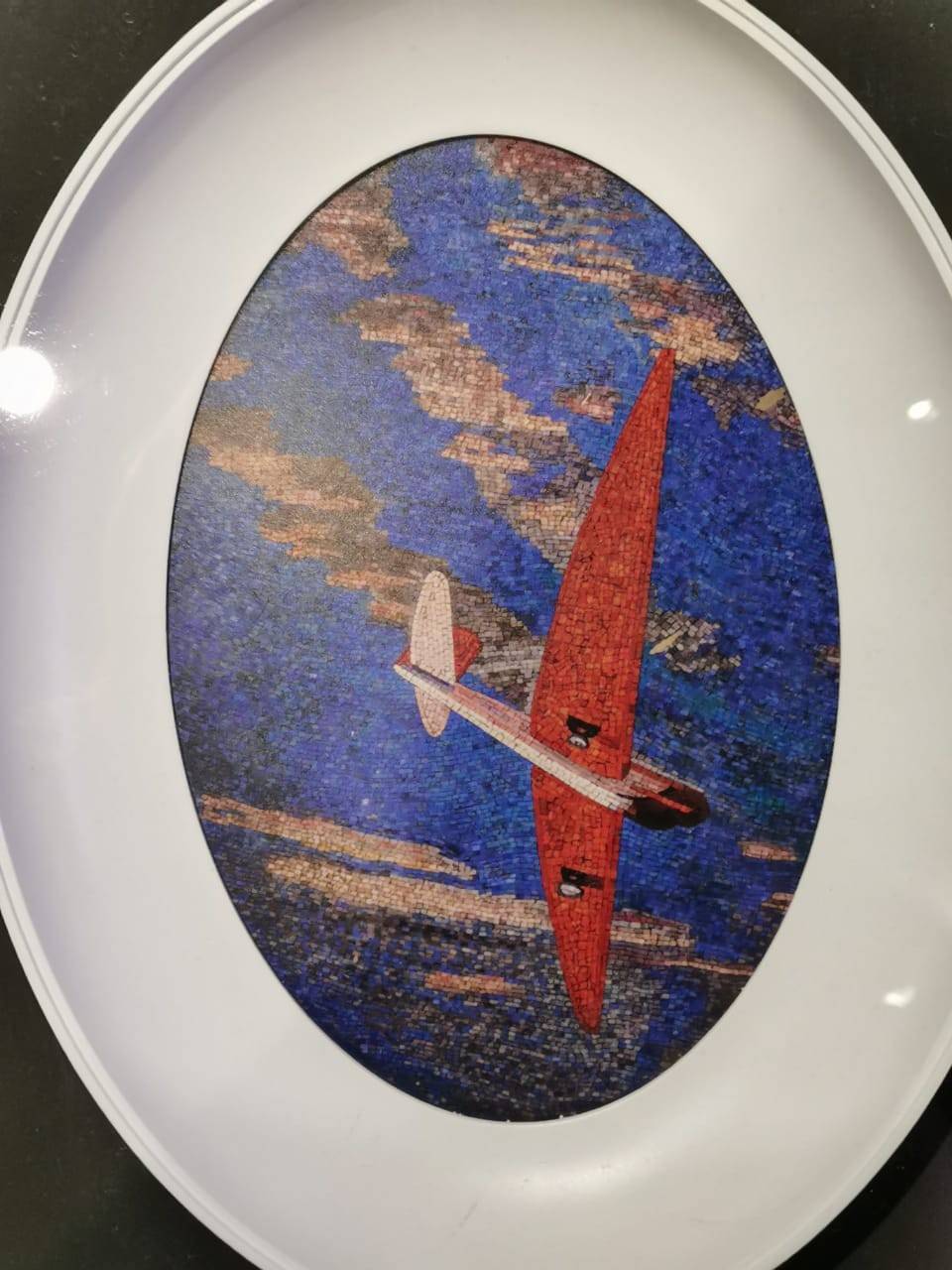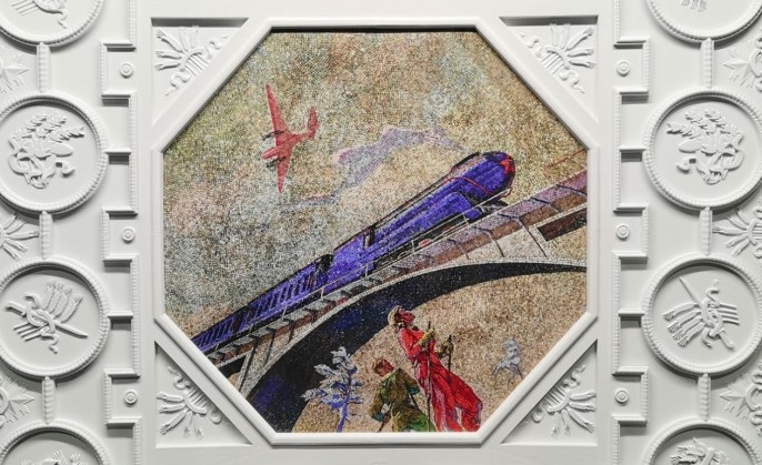 Символ выставки – так называемое небо-обманка на первых линиях московского метро. Обязательны - яблоневые сады и стройки, парашюты и дирижабли, бегуны и танцующие девушки на фоне синего неба с пышными облаками. Находясь внизу — созерцаем верх. Советский человек всегда видит небеса. Вертикаль пронизывает и уносится в необозримую высь. Нам нет преград! Подземелье оборачивается светлым чертогом. Александр Дейнека, участвуя в оформлении метрополитена, творил уникальные композиции для потолочных плафонов. Среди экспонатов – макеты потолочных плафонов для метро «Маяковская» и «Новокузнецкая». Сопроводительные таблички гласят, что была использована смальтовая и флорентийская мозаика. Тут же представлен макет перрона «Маяковской». Примечательный факт - братья Веснины, эти гуру зодчества, отмечали, что архитектор «Маяковской» Алексей Душкин слишком глубоко поместил мозаики в потолок. По сути, «утопил». Из-за этого просмотр значительно затруднён – все эти аэропланы и сады возможно созерцать лишь стоя прямо под изображениями. А кто же будет задирать голову в толчее, дабы увидеть мозаичное небо и белые чашечки парашютов?