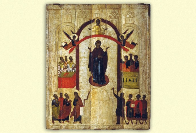 14. Самая ранняя из сохранившихся икон Покрова на дереве – икона 1399 г. из Зверина монастыря (ныне в Государственной Третьяковской галерее).