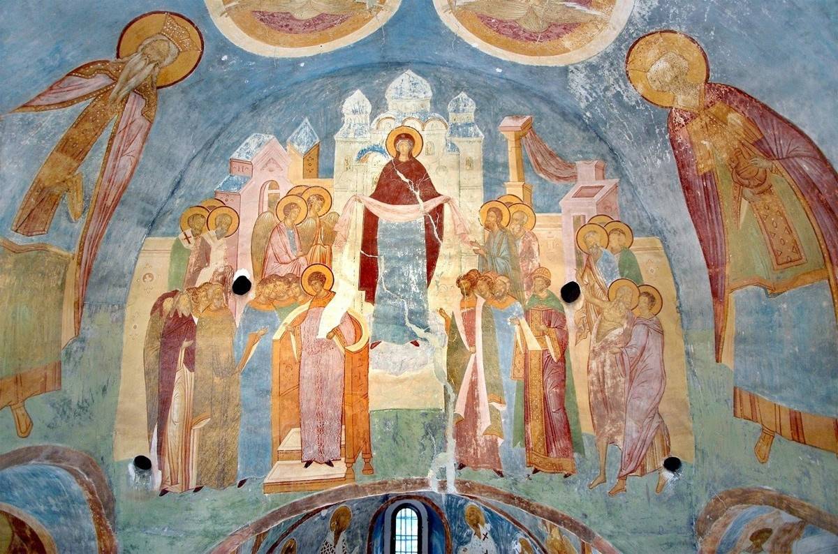 Очень важен факт размещения иконы Покрова на самом значимом месте храма – на алтарной стене – над иконою тронной Богоматери Никопеи (такая иконография тронной Богоматери вошла на Руси в традицию, но славное именование её почему-то забылось) в конхе и под Её же иконой «Воплощение»; превыше же всех Богородичных икон парит образ Спаса Нерукотворного, список с ещё одной чтимой константинопольской реликвии и свидетельство Его Воплощения. Таким образом само событие Покрова включается в литургический контекст.