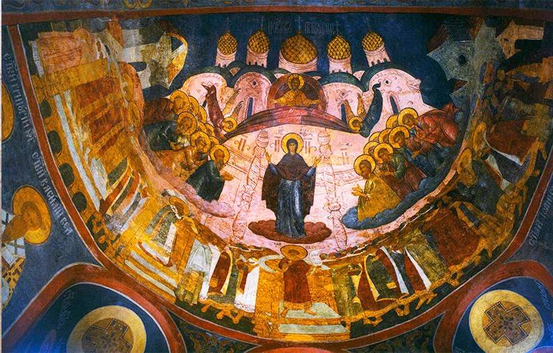 25. Сколь большое значение приобрёл праздник Покрова на Руси, показывает факт размещения его иконы в конхе алтарной апсиды Смоленского собора Новодевичьего монастыря в Москве. Очень красивая и гармоничная по композиции фреска 1598 года.