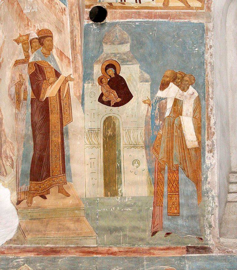 В случае с иконой на Суздальских вратах мы не можем сказать, что имеем здесь законченную иконографию, которую мы увидим далее. Более того, есть предположение, что византийская икона Покрова классической композиции в XII веке уже была во Владимире, а до этого и в Киеве, о чём также поговорим чуть позже. Но в таком случае икона на Суздальских вратах – это изображение только чуда с завесой, причём надпись «Покров Пресвятыя Богородицы» на ней является буквальным переводом греческого слова «скепи» – «покров», «защита» – относящегося и к Ризе, и к иконе Богоматери Никопеи, над которой и поднималась алая завеса, и эта икона на Суздальских вратах появилась в начале XIII века именно как воспоминание, неизбывная боль о прекратившемся чуде в разорённых Влахернах.