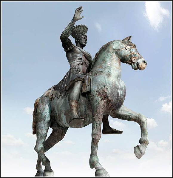 24. Реконструкция памятника Юстиниану. На голове его – корона-плюмаж из перьев павлина, который считался птицей райской, символом воскресения и жизни вечной.