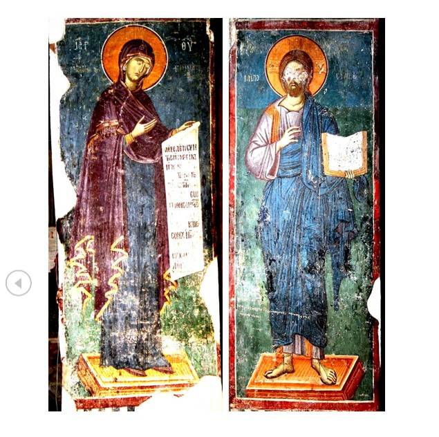 11-12. Богородица Параклисис (на Ней двойной плат-мафорий) и Христос Элеймон (Милостивый). Фрески на алтарных столпах в церкви св. Никиты (село Чучер близ Скопье, Македония) выполнены до . артелью солунских художников Михаила Астрапы.