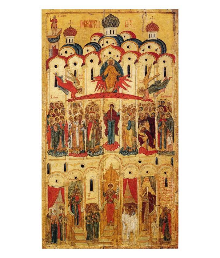 23. На великолепной иконе XVI века (1530-е гг. Из собрания Н.П. Лихачёва, Государственный Русский музей), да и на некоторых других тоже, Покров утратил полукруглую форму – он становится почти прямым – и так почти потерялся смысл алой завесы как небесного свода. Но сама по себе данная икона по-своему уникальна и смотрится очень красиво и празднично.