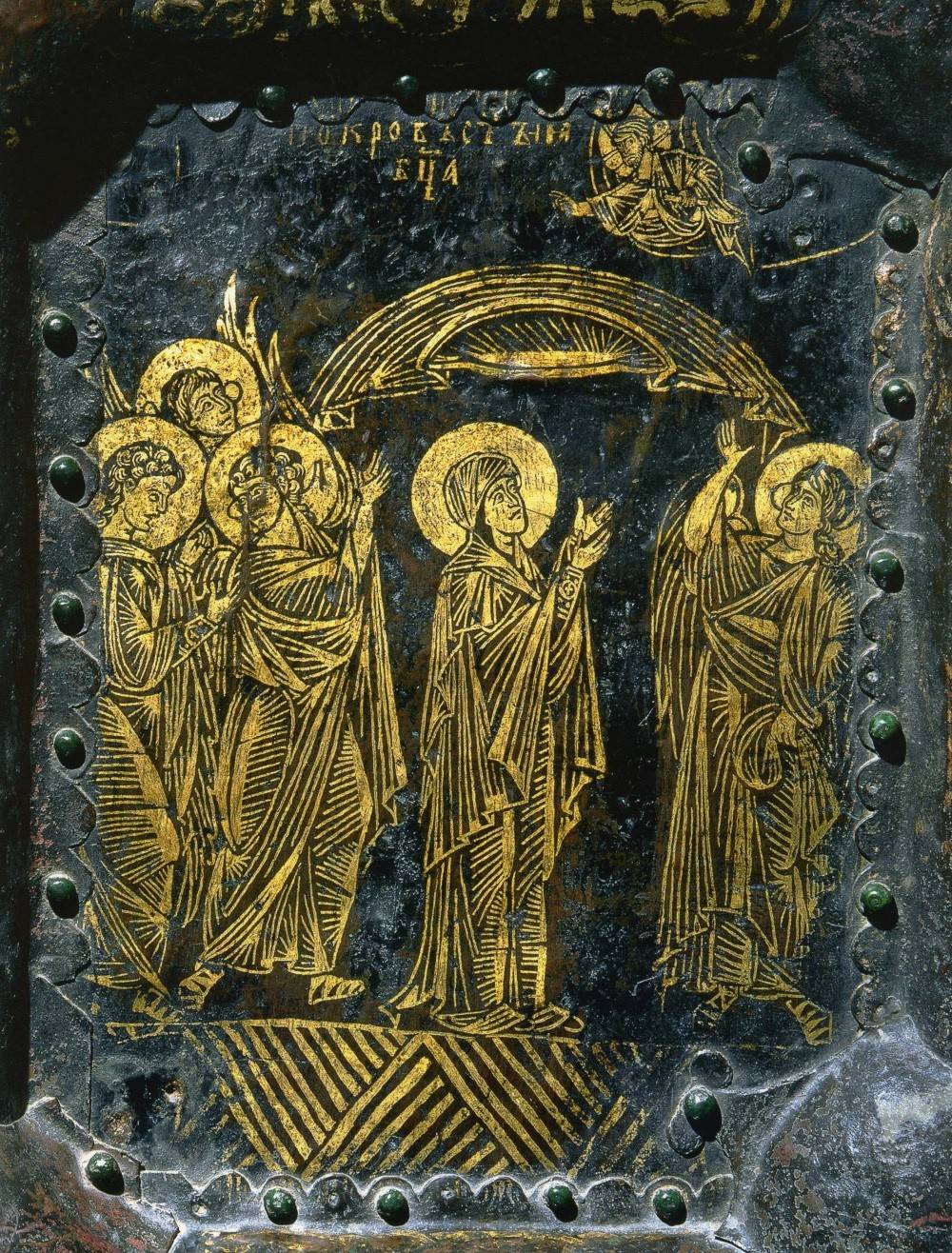 Итак, начало X века. Не так давно закончилась трагическая эпоха иконоборчества, потрясшая самые основы государства. Понятно, что после победы иконопочитателей ромеи стали благоукрашать свои церкви священными изображениями, но для воссоздания утраченного требовалось множество усилий и, главное, времени, поэтому многие храмы стояли ещё с голыми стенами, единственным украшением которых были самые простые кресты или оставшиеся от эпохи иконоборчества орнаменты. Влахернский Большой храм, потерявший свои иконы – и мозаичные, и деревянные, если таковые были, – всё ещё был украшен, помимо крестов, мозаичными узорами в раннехристианском стиле: виноградной лозой с птичками и животными, геометрическими орнаментами с цветами и листьями, напоминающими райский сад. Возможно, уже появились на стенах деревянные иконы Божией Матери типа Одигитрии: списка с чудотворной из монастыря Одигон и совсем новой в то время иконографии Елеусы – «Милостивой» или «Ласкающей», которая на Руси получила ёмкое именование «Умиление». Ещё не обретена древняя икона Богородицы Никопеи в капелле Агиа Сорос, замазанная штукатуркой, т. е. спрятанная от иконоборцев. Главная же святыня Влахернского храма – Риза Богоматери – оставалась в неприкосновенности.