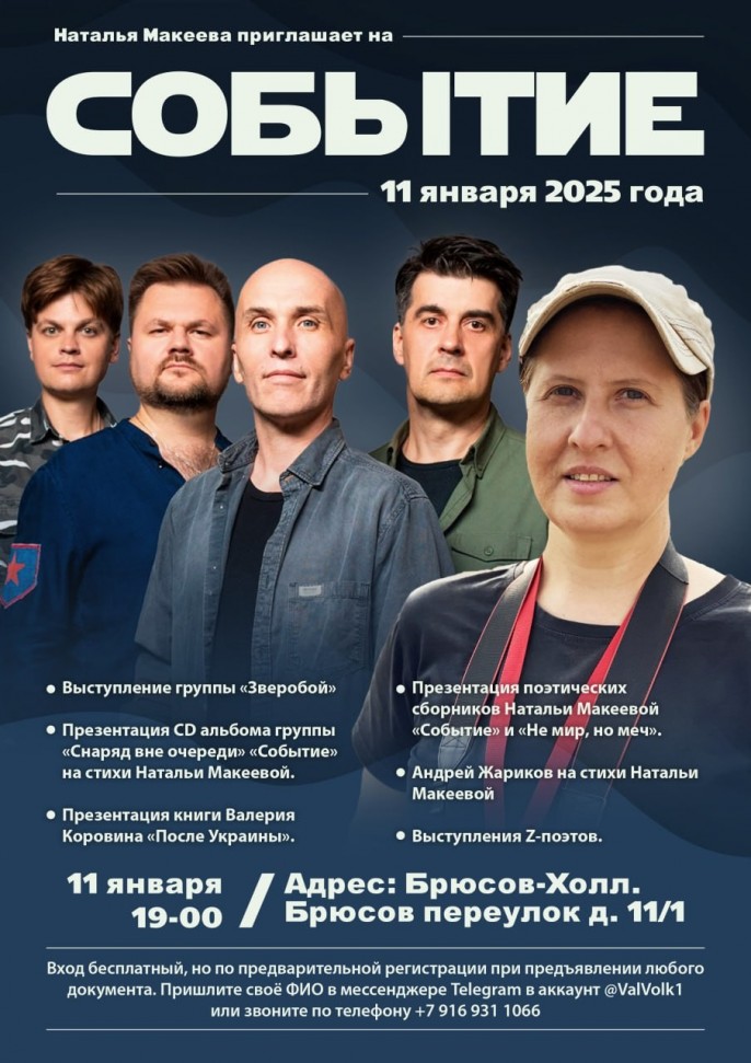После презентации книги «После “Украины”» на той же площадке пройдёт музыкально-поэтический вечер, организованный экспертом Изборского клуба, членом экспертного совета движения «Русская мечта», поэтом Натальей Макеевой. Выступят группа «Зверобой» и Андрей Жариков, который исполнит песни на стихи Макеевой. Прозвучат Z-стихи и просто стихи.
