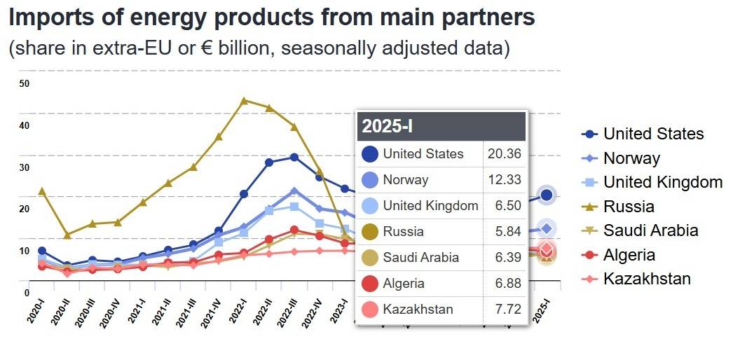 В 2024 году стоимость закупок Евросоюзом американских энергоносителей составила 76 млрд долл., по данным американского Агентства энергетической информации, включая 54 млрд долл. сжиженного газа, а в I квартале 2025 года - 20 млрд евро по данным Евростата. Ещё по итогам 2023 года в США сообщали о выручке нефтегазового сектора в 479 млрд долл., а мировые цены с того года немного снизились.
