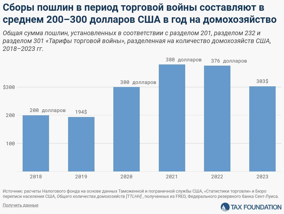 В расчёте на домохозяйство пошлины составили примерно 200-300 долл. в годы Трампа и 300-380 долл. в годы Байдена. Суммарно все ранее введенные пошлины дают 2,8% от доходов федерального бюджета США — не от ВВП, а именно от доходов (137 млрд в год из 4,9 трлн доходов при 1,8 трлн дефицита бюджета). Введённые пошлины на отдельные товары и страны в пересчёте на вcю стоимость импорта эквивалентны 2,8% – это масштаб комиссий банков за переводы по платёжным картам при покупках в организациях розничной торговли или порядка половины усредненного налога с розничных продаж (НДС в США нет).