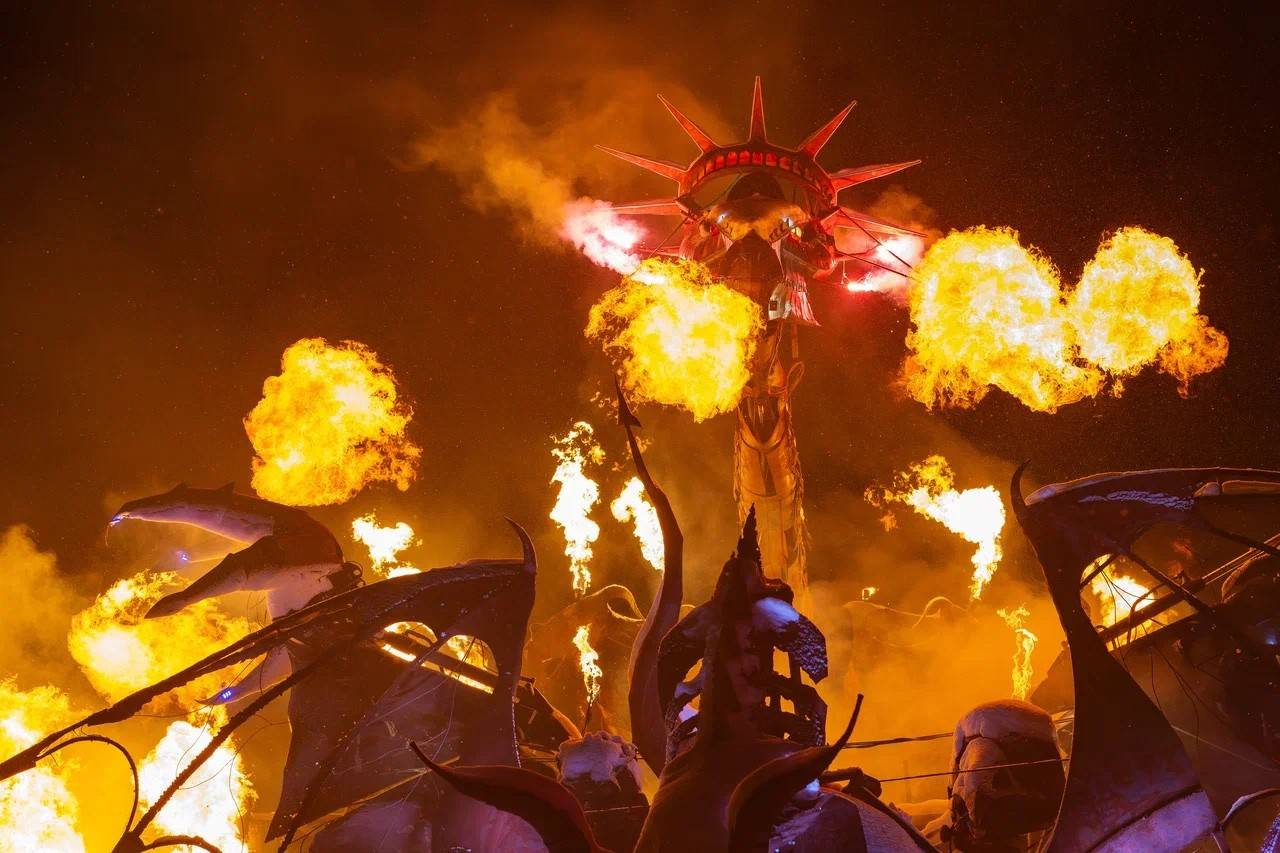 Сказитель говорит о Коне апокалипсиса- и конь с лазерного экрана мчит на вас. Вспомнишь тут братьев Люмьер, напугавших зрителей «Прибытием поезда», летящего на зрителей с экрана. А голова Статуи свободы «сверлит» тебя лазерным глазом.Но она - у подножия крейсера «Россия», а над ней- Изборский холм- собрание русских земель. Это на Гудзоне ты, статуя, возвышаешься над всеми. Но здесь ты - у подножия земель русских.