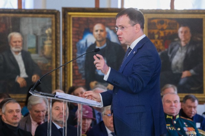 Фото: Сергей Карпухин/ТАСС. Помощник президента РФ, председатель Российского военно-исторического общества Владимир Мединский на XVII Внеочередном съезде Союза писателей России в Доме Пашкова.