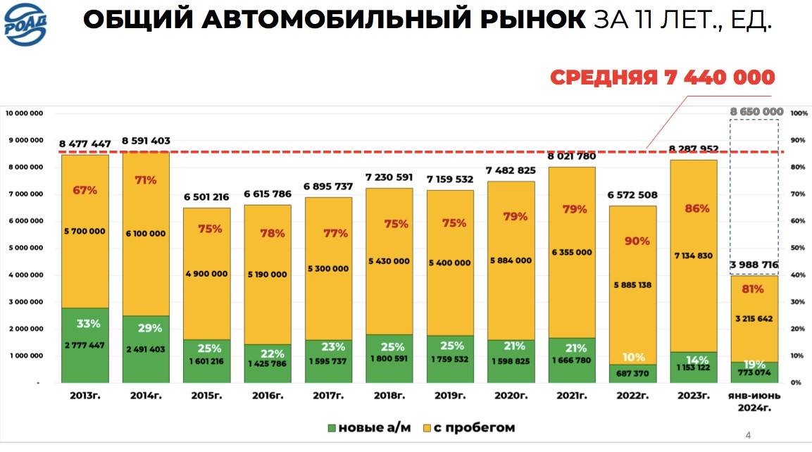 Что касается рынка в денежном объеме он, конечно, выше уровня десятилетней давности – в 2024-м ожидается в размере 15,6 млрд против 4,51 млрд в 2013-м, по новым автомобилям – соответственно, 6,93 и 2,52 млрд руб. Но, как отметил, президент РОАД Алексей Подщеколдин: «Если перевернуть эту картинку по отношению к удешевлению курса рубля к доллару, мы видим, что в прошлом году рынок восстановился до уровня 2013 года, в этом году немного превысит. Это превышение – девальвация рубля. В 2013 году доллар стоил 30 рублей, сейчас примерно 100. То есть, к сожалению, рынок не растет». Впрочем, хотя бы и здесь рынок вернулся на уровень 2013 года, при том, что автомобили (в пересчете на доллары и средние зарплаты) дешевле не стали.