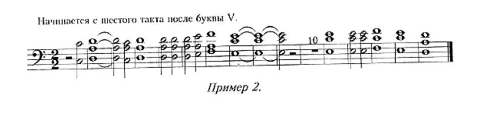 Теперь, опираясь на всё изложенное, мы можем попытаться реконструировать услышанное композитором. Монастырский хор в основном – в октавном удвоении – пел мелодию верхнего голоса феофановского полиелея (очевидно, басы с первыми тенорами). Тенора же (вторые) вели свою партию, переступая по двум звукам, отстоящим друг от друга на терцию. Вот и получились колоритные пустоты, привлекшие внимание Римского-Корсакова.