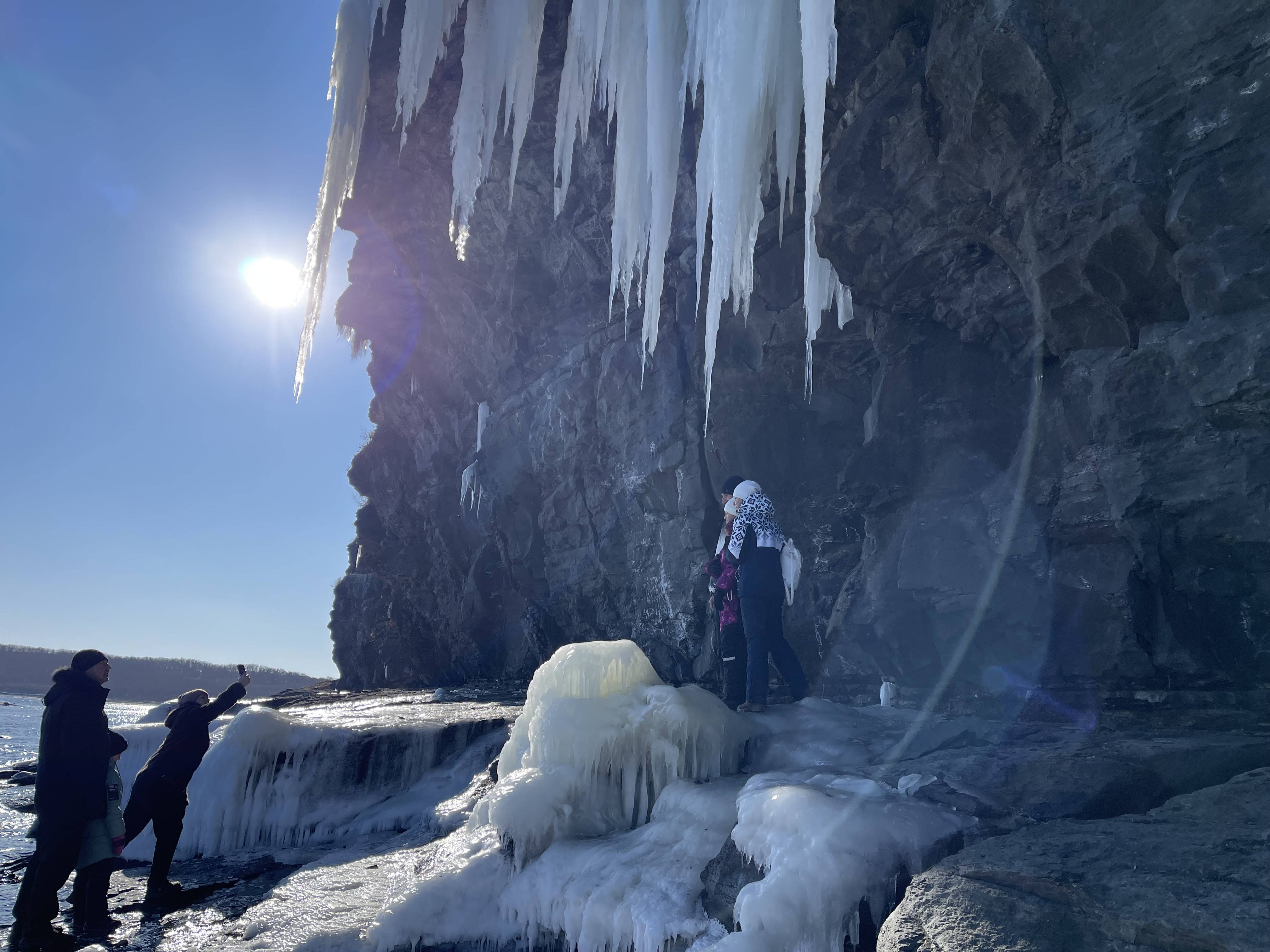 Здесь не надо искать, что приносит радость. Не надо никого призывать – «Замечайте красоту, и вы сможете заметить большее». Надо просто собраться, и в эти январские дни отправиться на о. Русский, на зимний берег между мысом Вятлина и Ахлестышева, чтобы полюбоваться на чудо. У жителей этих мест это называется даже немного игриво: «Пойти к сосулькам»… На том берегу невозможно не улыбаться, замирая от восхищения, рассматривая фантазии природы, отлитые в ледяной хрусталь.