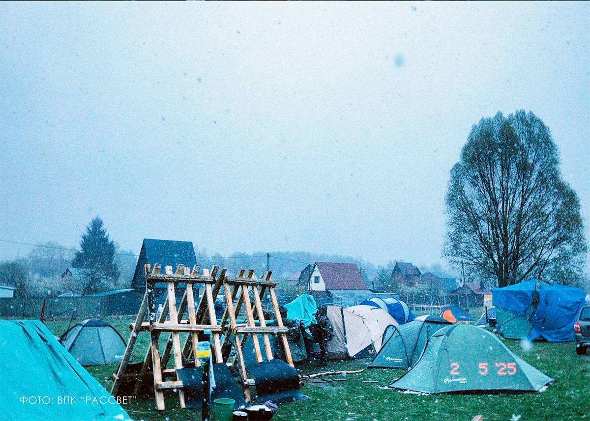 Залило и на всю ночь. Дождь холодный, и воздух от него резко похолодал, влажный, промозглый. Тут уж командам приходилось держаться, как могут, как сумели изготовиться к непогодам. Палатки, тенты, навесы, костры, походные печки. Хорошо, что дров успели закупить достаточное количество. А под утро шум ливня, барабанившего по крышам, тентам, палаткам, вдруг… прекратился. Потому что дождь перешел в снегопад, заваливая белым месивом и поляну конно-спортивного клуба, и все деревья, окрестности, и палаточный лагерь. Стихия круто поигралась и шквалами ветра. Надувала и кидала тенты. У «Русичей» сломала подпорку и сорвала навес.