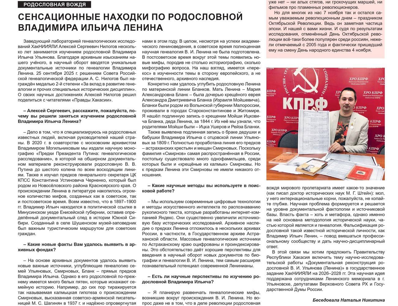Заведующий лабораторией генеалогических исследований ХакНИИЯЛИ Алексей Сергеевич Нилогов несколько лет занимается изучением родословной Владимира Ильича Ульянова. Благодаря архивным изысканиям нашего учёного, в научный оборот вводятся уникальные документальные источники по генеалогии Владимира Ленина. 25 сентября 2025 г. решением Совета Российской генеалогической федерации А. С. Нилогов был награждён медалью 2-й степени «За вклад в развитие генеалогии и прочих специальных исторических дисциплин». О своих научных достижениях Алексей Нилогов решил поделиться с читателями «Правды Хакасии».