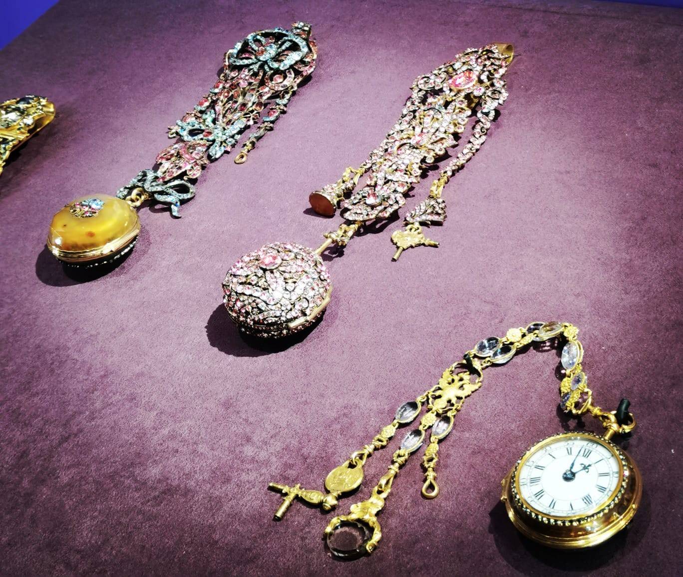 В XVIII-XIX веках часы считались барским удовольствием, а часовщики были весьма серьёзными ремесленниками. Больших денег стоил и механизм, и его оформление. Часы закреплялись на поясе цепочками-шатленами, а те златые цепи обходились владельцу ещё дороже, чем циферблат, пусть и от Брегета. В экспозиции представлены часы на великолепных шатленах. Золото-бриллианты-гранат-агат-шпинель – вот неполный список того, что было использовано при их создании.