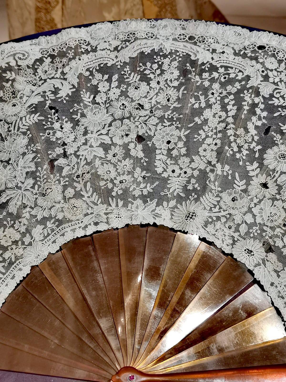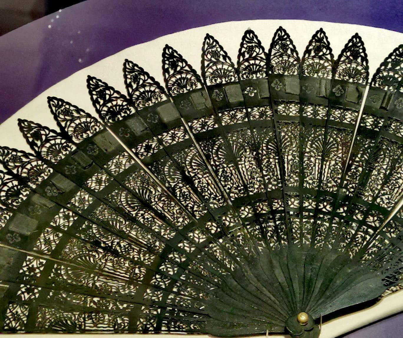 Разновидностью plié были веера, состоявшие из резных пластин, связанных ленточкой. Перед нами – один из таких образцов с «готическими» верхушками пластин – в 1820-1840-х годах популярным было Средневековье, и поэтому в дизайне прослеживалась псевдо-готика. На другом стенде – перьевой веер, именовавшийся pliant. Например, в стихотворении Игоря Северянина о том, как «графиня ударила веером страусовым опешенного шевалье» говорится именно о pliant.