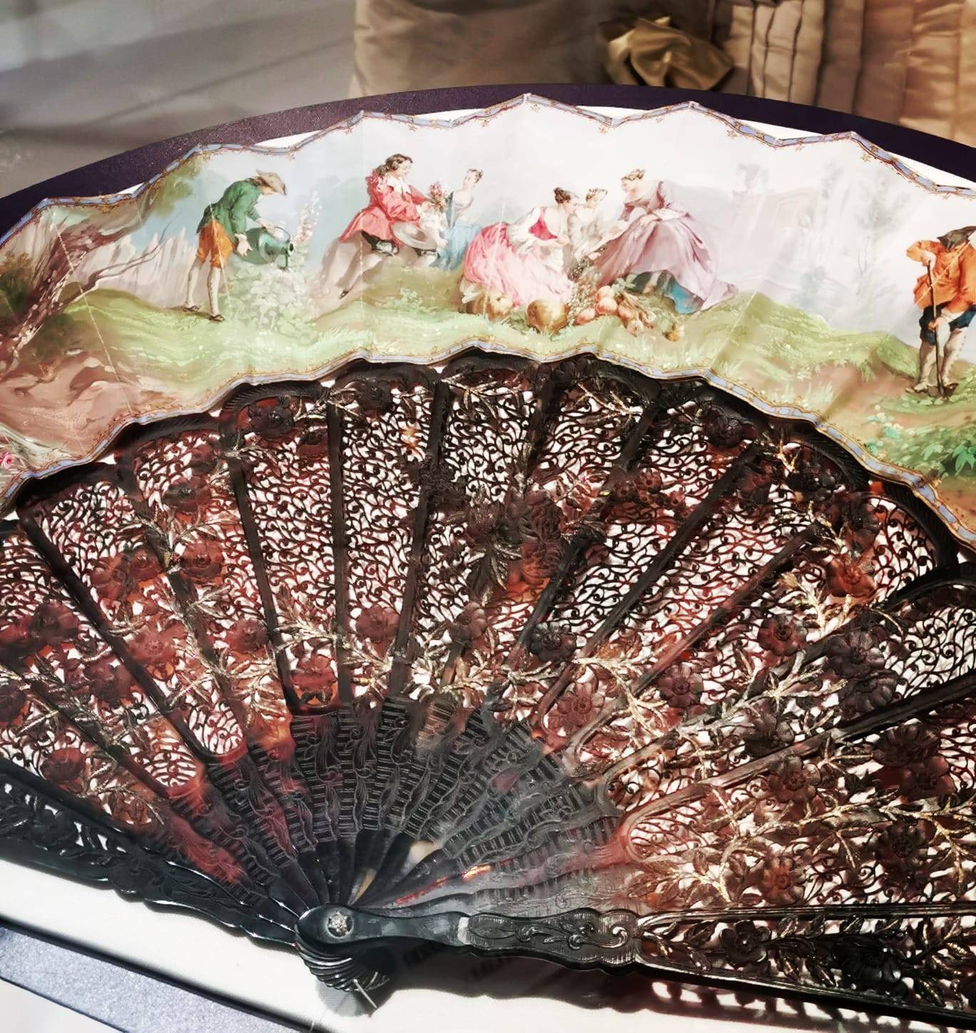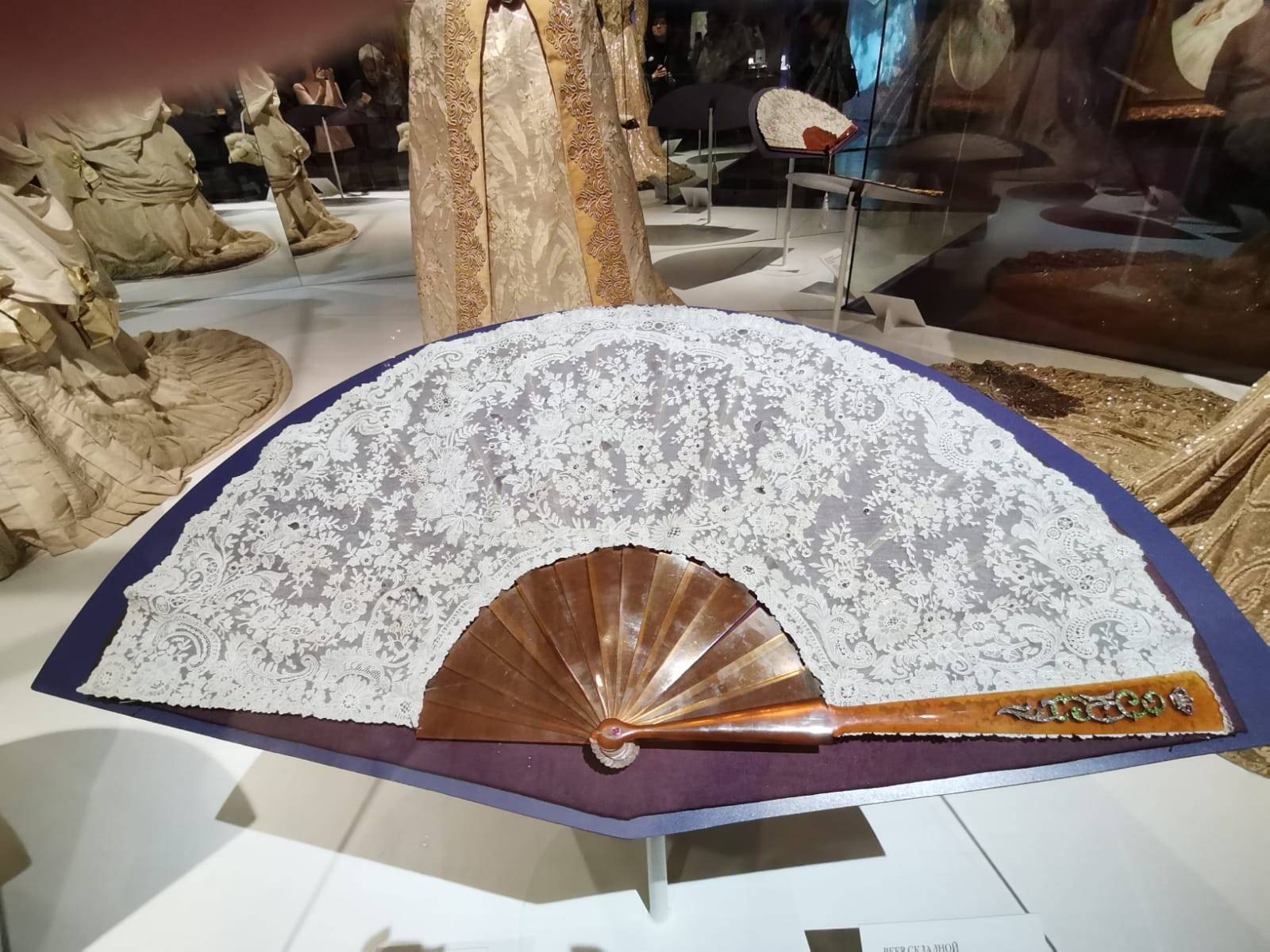 Мы же направляемся к стендам с аксессуарами! При всём разнообразии декора, существовало всего два типа опахал – plié и pliant. Вот - веер plié из тончайшего кружева. Вещица принадлежала Зинаиде Юсуповой. А тут - plié с галантной сценкой на веерном экране – дамы и кавалеры отдыхают на лоне природы. Plié состоял из веерного станка, то есть пластин и плиссированного экрана из ткани, кружева или картона красивой картинкой.
