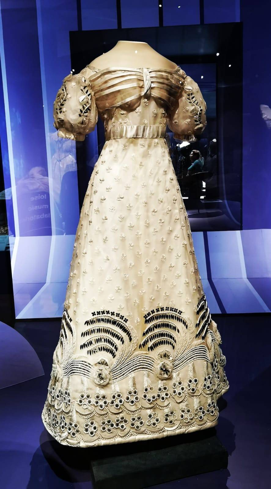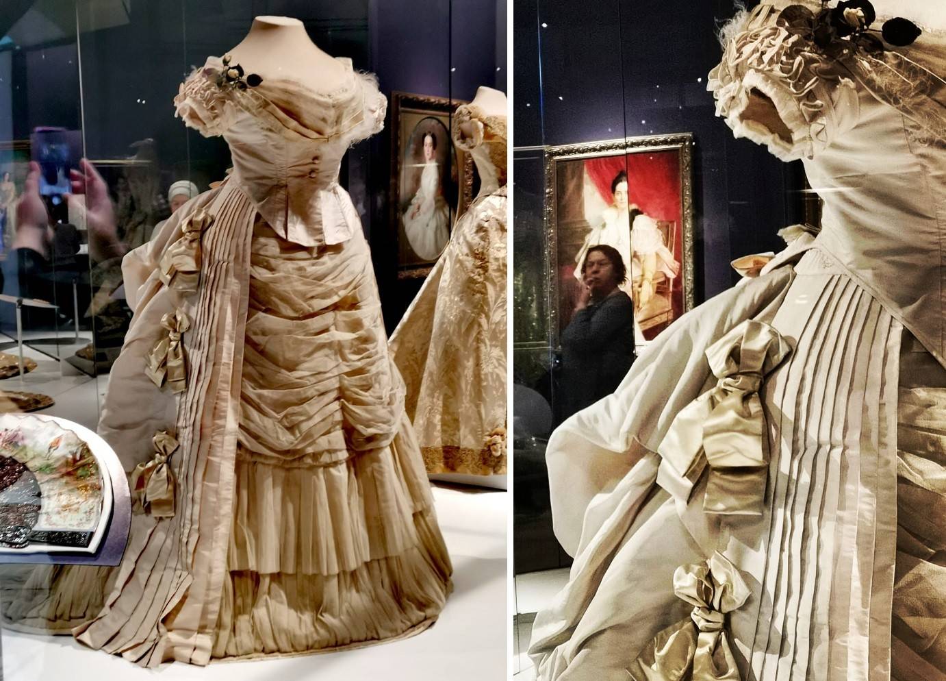 Несмотря на то, что платьев не так уж много, они позволяют отследить историю костюма с 1820-х по 1910-е годы. В эпоху позднего ампира в моде была завышенная талия, как и в начале века, но никто уже не довольствовался простотой и лапидарностью – бальное платье 1825 года обильно декорировано по расширенному подолу, как и рукава-фонарик. К сожалению, среди экспонатов нет платьев 1830-х-1840-х с мощными плечами на контрасте с тончайшим станом, как нет и кринолиновых юбок 1950-1860-х годов. Зато перед нами – чарующее платье с турнюром. Эта мощная конструкция, создававшая пышность …чуть пониже спины, вызывала не только восторг, но и смех в виду своей вычурности.
