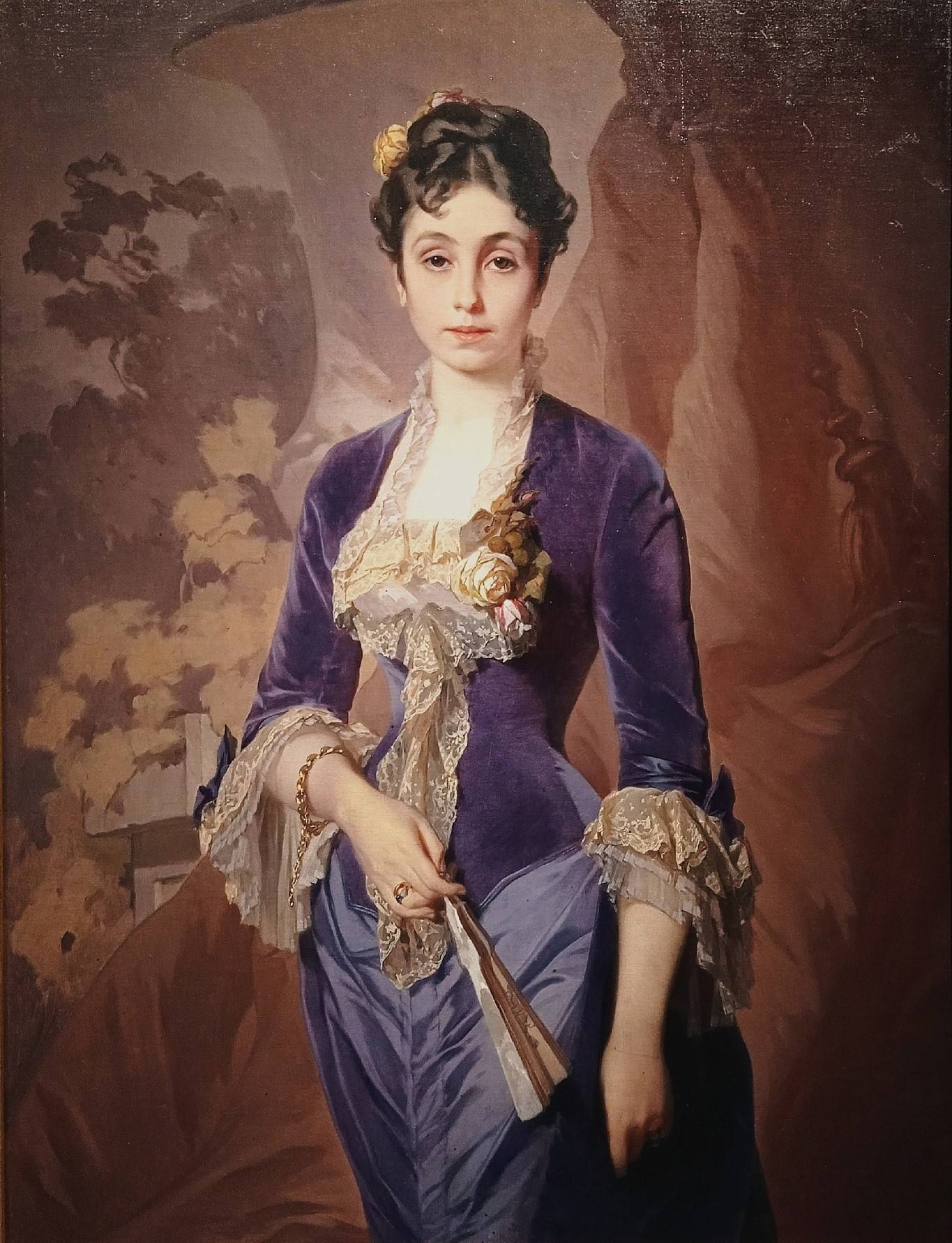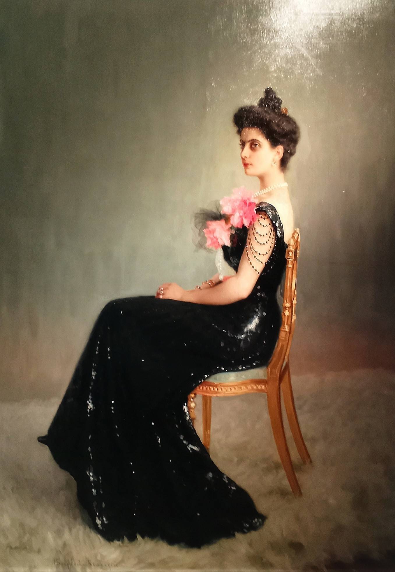 Невероятно хорош портрет Марии Абамелек-Лазаревой, написанный Николаем Богдановым-Бельским. Чёрное, блестящее облачение, цветы на корсаже, высокая причёска из тёмных волос – княгиня словно бы воплощает типаж фамм-фаталь эры Модерн.
