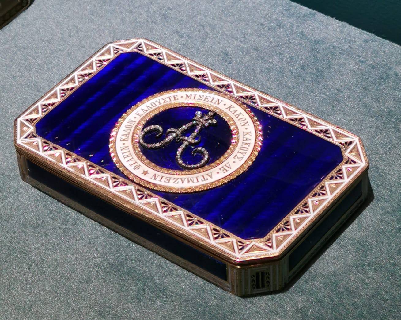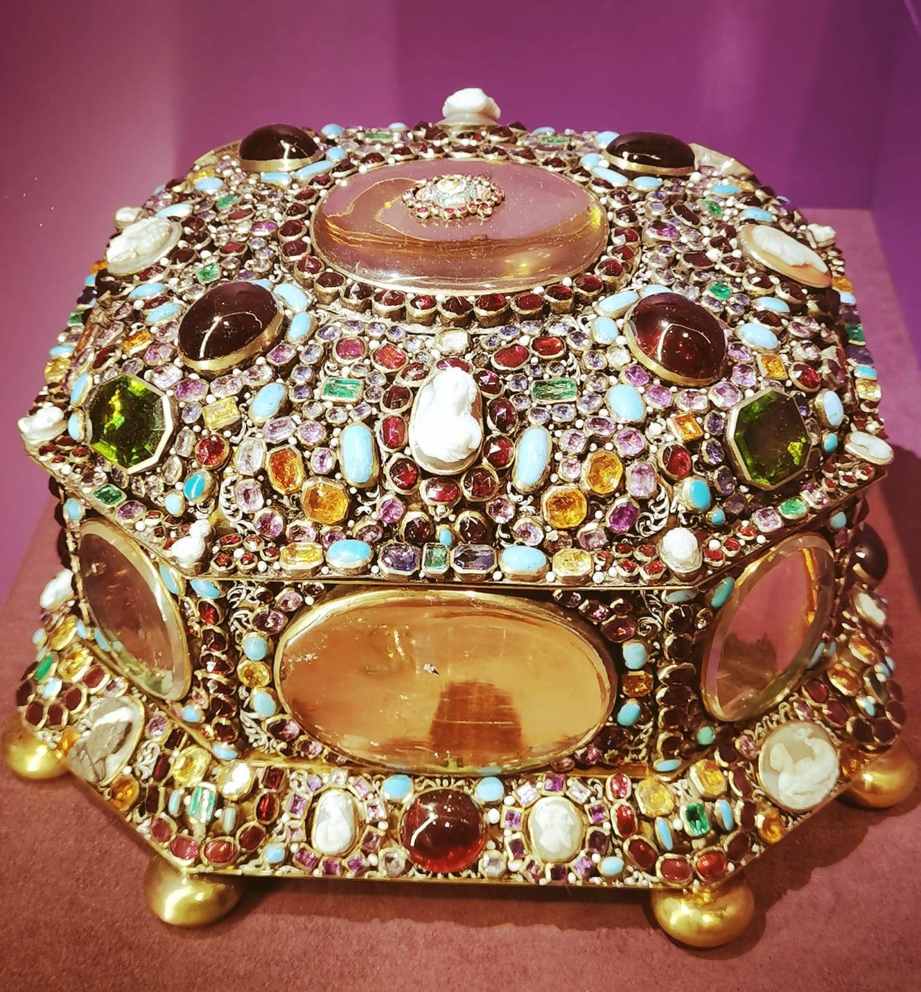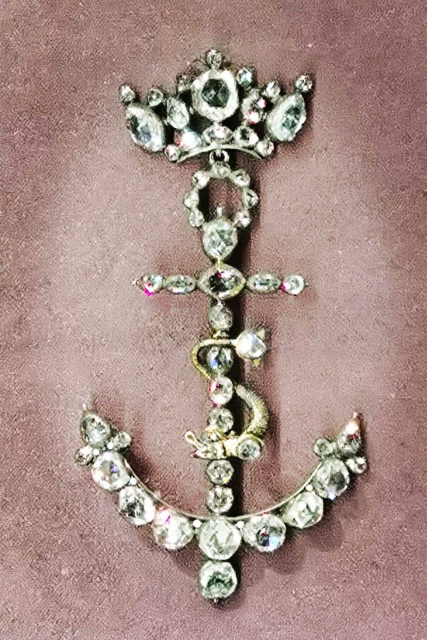 Первый зал – посуда из чистого золота, дорогостоящее зеркало, старинные ларцы, оружие, украшенное каменьями. Тут и предметы, завезённые во времена Петра – допустим, ларец из Саксонии и бриллиантовая голландская подвеска в виде якоря, и личные вещи Анны Иоанновны, и кубки Павла I.