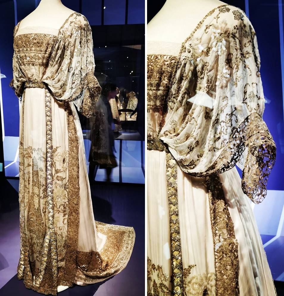 Или, например, платья от сестёр Калло, предлагавших своим клиенткам вечерние платья из атласа, отделанные золотой и серебряной вышивкой. Визитная карточка сестриц Калло - наряды из ткани lamé - с вплетенными блестящими нитями. Тут же - изделия дома «Бризак», французов, обосновавшихся в Петербурге и ставших поставщиками Двора. Интересно, что для выставки были тщательно подобраны платья разных эпох, но почти все - цвета беж.