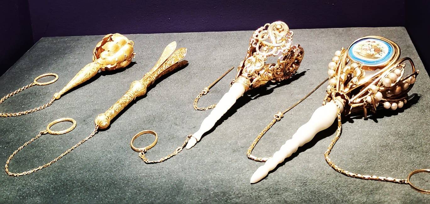 На одном из стендов – сверкающие портбукеты, футлярчики для цветов, крепившиеся к платьям. Крупные портбукеты носили в руках. В XVIII-XIX столетиях бытовал «язык цветов» и составленный букет мог означать целую фразу – признание в любви, отказ, предостережение, готовность к флирту или танцу.