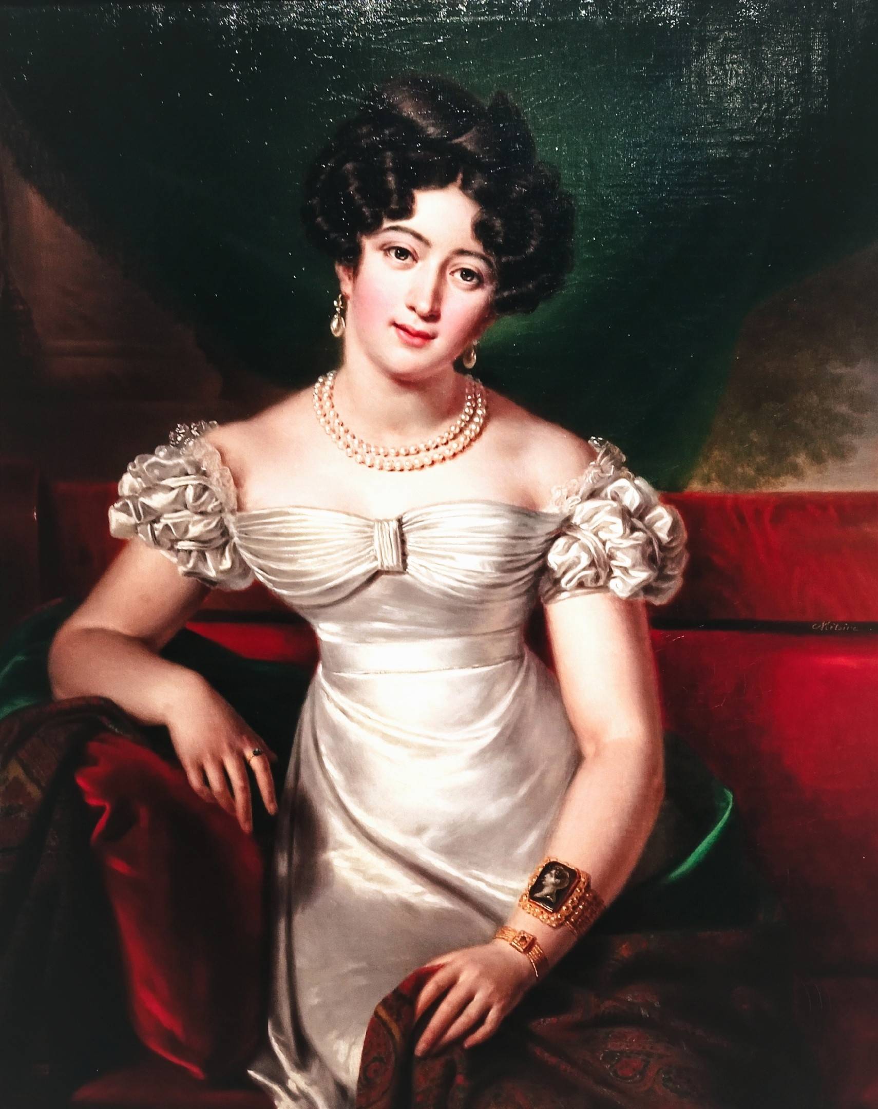 Дивен портрет графини Юлии Самойловой кисти Бенуа-Шарля Митуара. Одна из самых привлекательных женщин обеих столиц изображена в белом атласном платье с глубоким декольте. Жгучая брюнетка с идеальной кожей да гладкими формами, она вызывала восторг и зависть. Самойлова напоминала героиню авантюрного романа – тут и бурная личная жизнь, и путешествия, и даже скандалы.