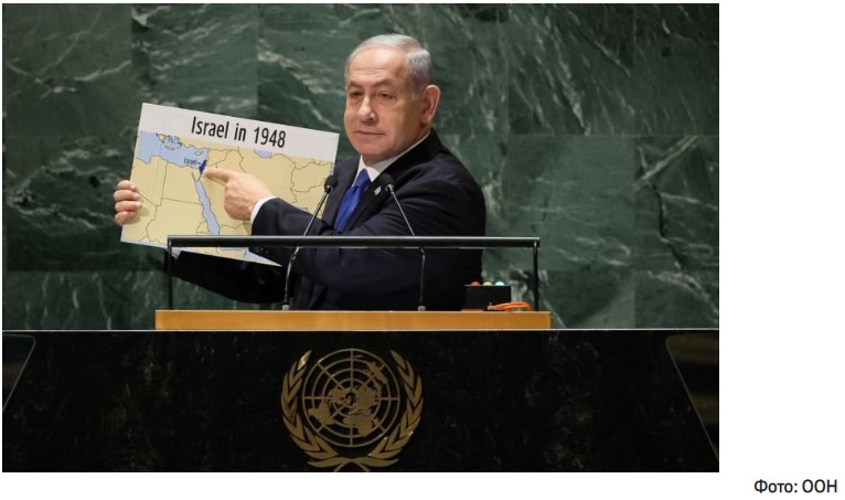 Для начала отметим, что на мировую общественность произвела странное впечатление речь Нетаньяху, когда он на осенней сессии Генеральной Ассамблеи ООН 22 сентября 2023 года продемонстрировал «карту Израиля 1948 года», на который напрочь отсутствовала Палестина (?). Именно в том году было принято решение ООН о создании на территории бывшей «Подмандатной британской Палестины» двух независимых государств – Израиля и собственно Палестины. И вот в 2023 году премьер Израиля откровенно демонстрирует своё видение: «Вся территория Палестины – это Израиль». И как это понимать?