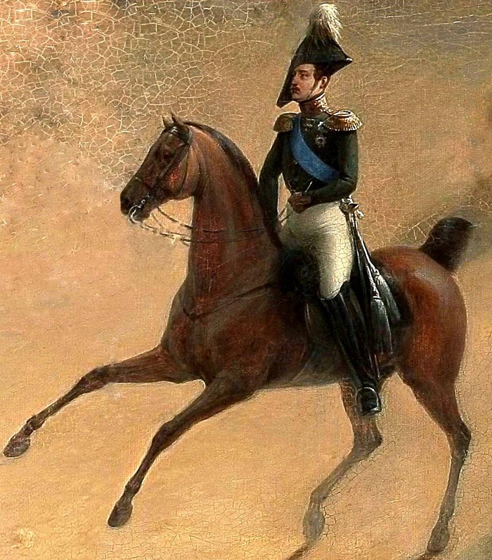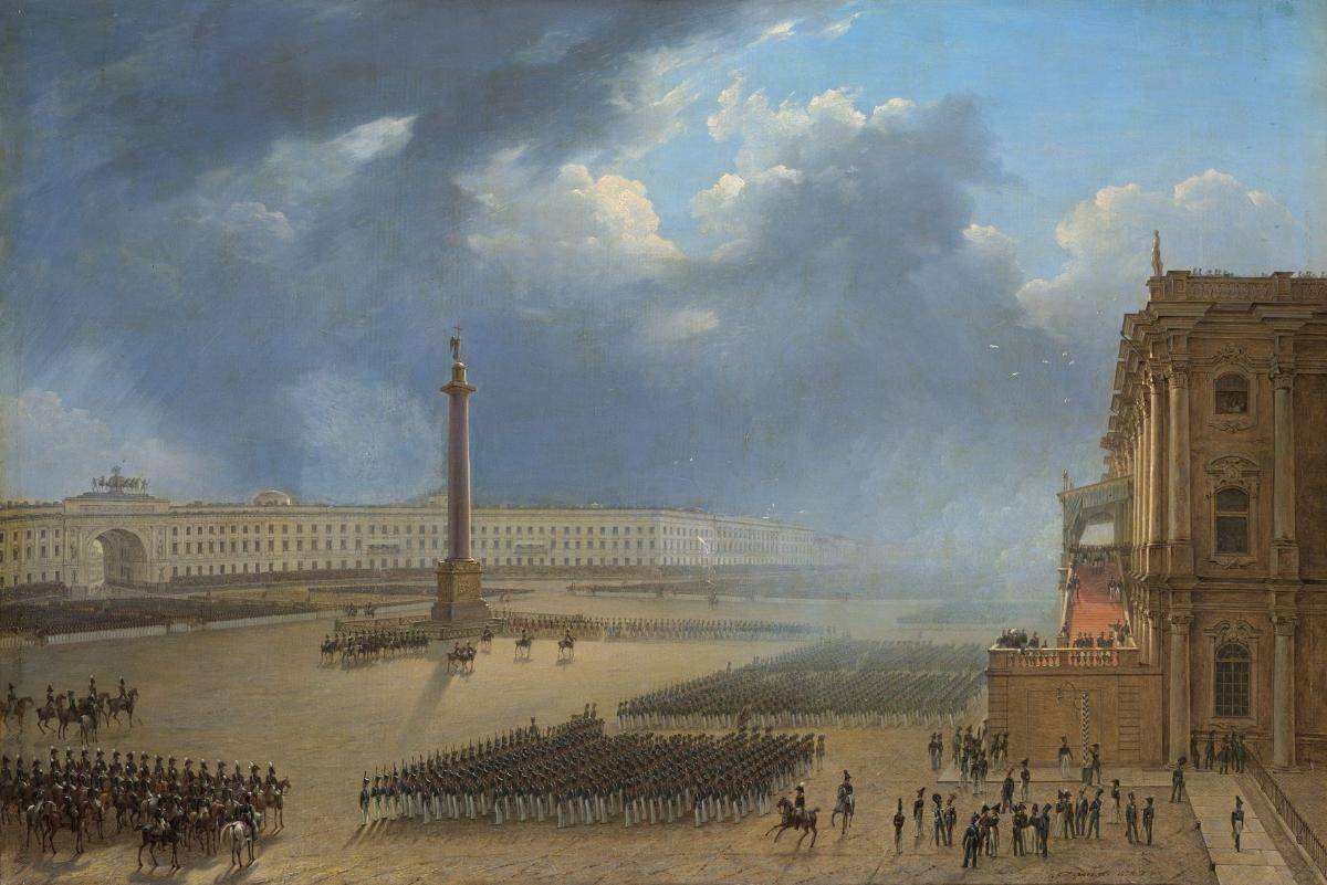 Ещё одна эпичная вещь Григория Чернецова - «Парад по случаю открытия памятника Александру I в Санкт-Петербурге 30 августа 1834 года». Николай Павлович с детства благоговел перед Александром, считая его эталоном правителя. Памятник был задуман в виде колонны и спроектирован Огюстом Монферраном по заказу Николая I, пожелавшим увековечить победу царя-ангела над дьявольскими силами Бонапарта.