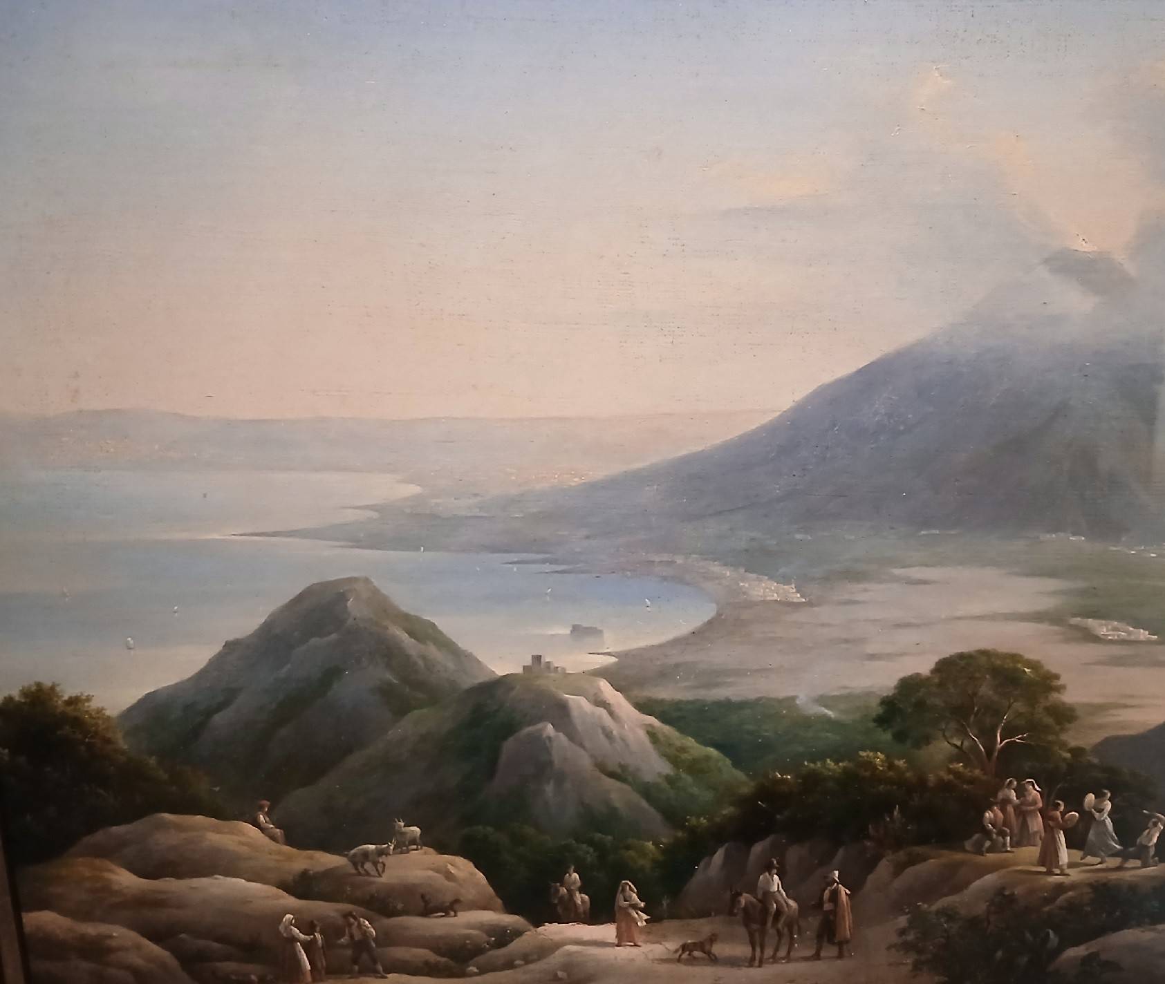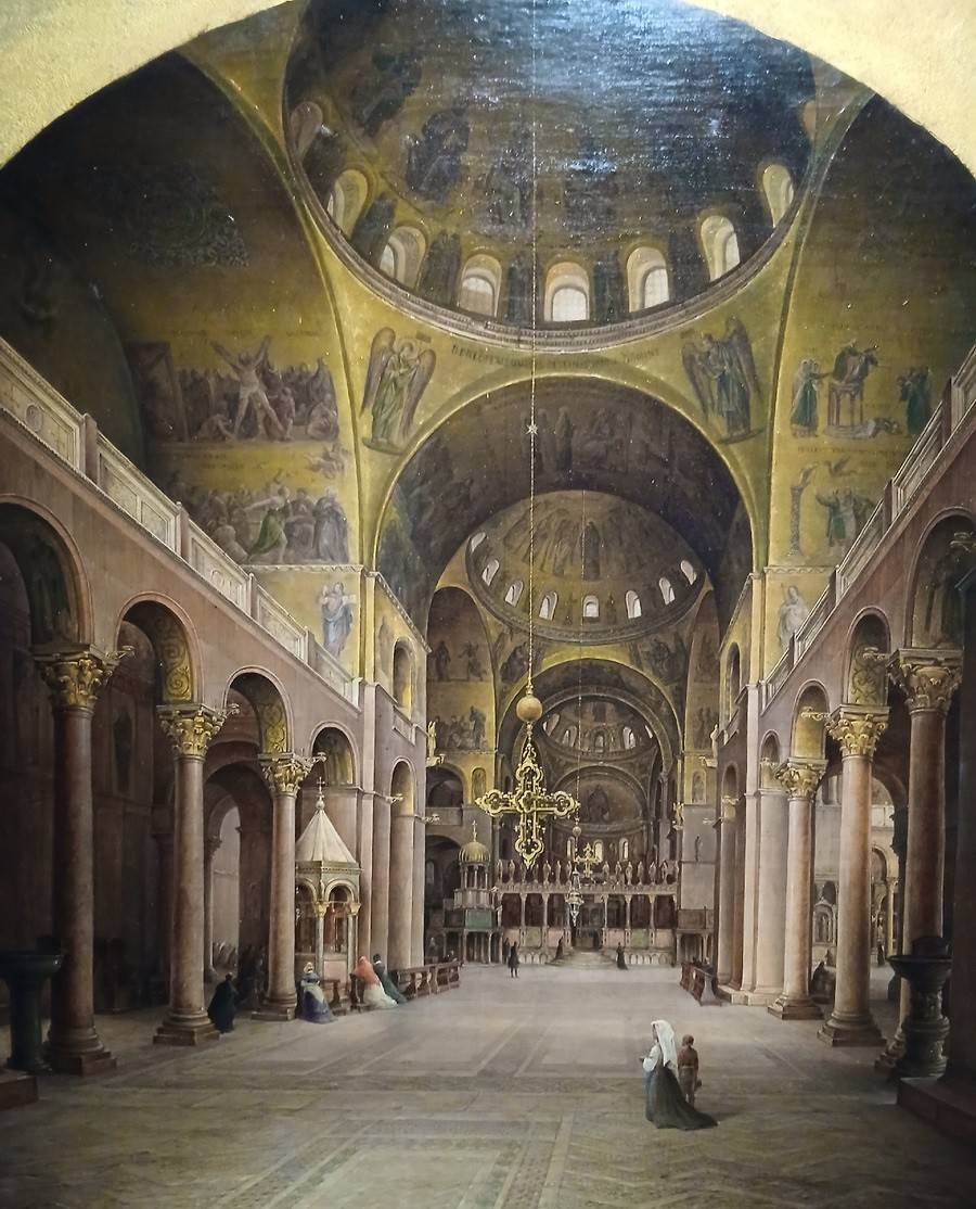 Столь же правильно и, увы, безлико выглядит «Внутренний вид собора Святого Марка в Венеции» Никанора Чернецова. Автор фиксирует своды, неф, колонны. Для живости он добавляет посетителей – допустим, итальянку в белом головном уборе «товалья». Впрочем, картина Чернецова-старшего «Вид на Везувий» пронизана духом – это не лишь местность близ опасной горы. Тут есть глубокое чувство, где безмятежность слита с тревогой. Везувий тревожил всех – и ученых, и творцов, и обывателей, а в бульварной прессе мелькали «страшные рассказы» о том, как вулкан снова пробудился и лавою накрыл окрестности.