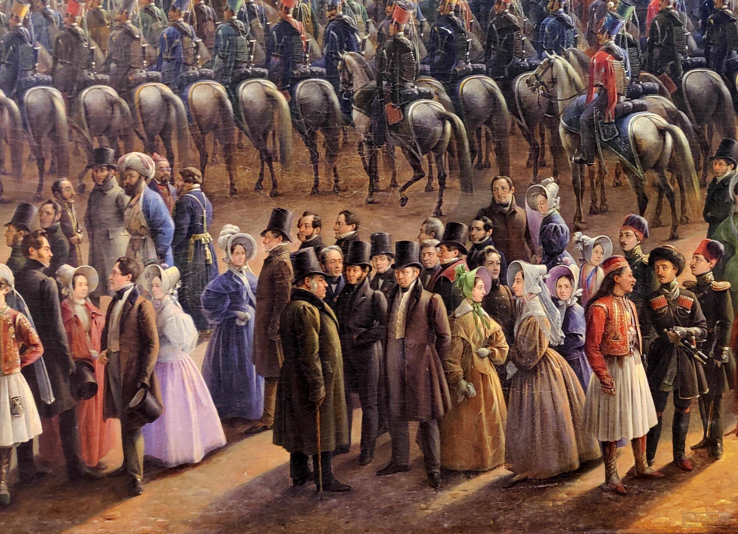 В экспозиции представлено роскошное полотно Григория Чернецова «Парад по случаю окончания военных действий в Царстве Польском 6-го октября 1831 года на Царицыном лугу», где художник проявил себя не только в качестве пейзажиста – здесь масса узнаваемых лиц, в том числе и сам венценосец. На гигантском групповом портрете - около трёхсот известных персон, что делает «Парад…» ценным документом. Список героев утверждал лично государь и, благодаря этому легко судить, кого император счёл важными и нужными людьми. Помимо знаменитостей, там есть купцы, крестьяне, и ремесленники – Николай всегда пёкся о народном единстве. Изначально от Чернецова требовался «…вид в ту меру, как писана картина Франца Крюгера „Парад в Берлине“». Наш мастер перещеголял немца и это отметили все созерцатели полотна.