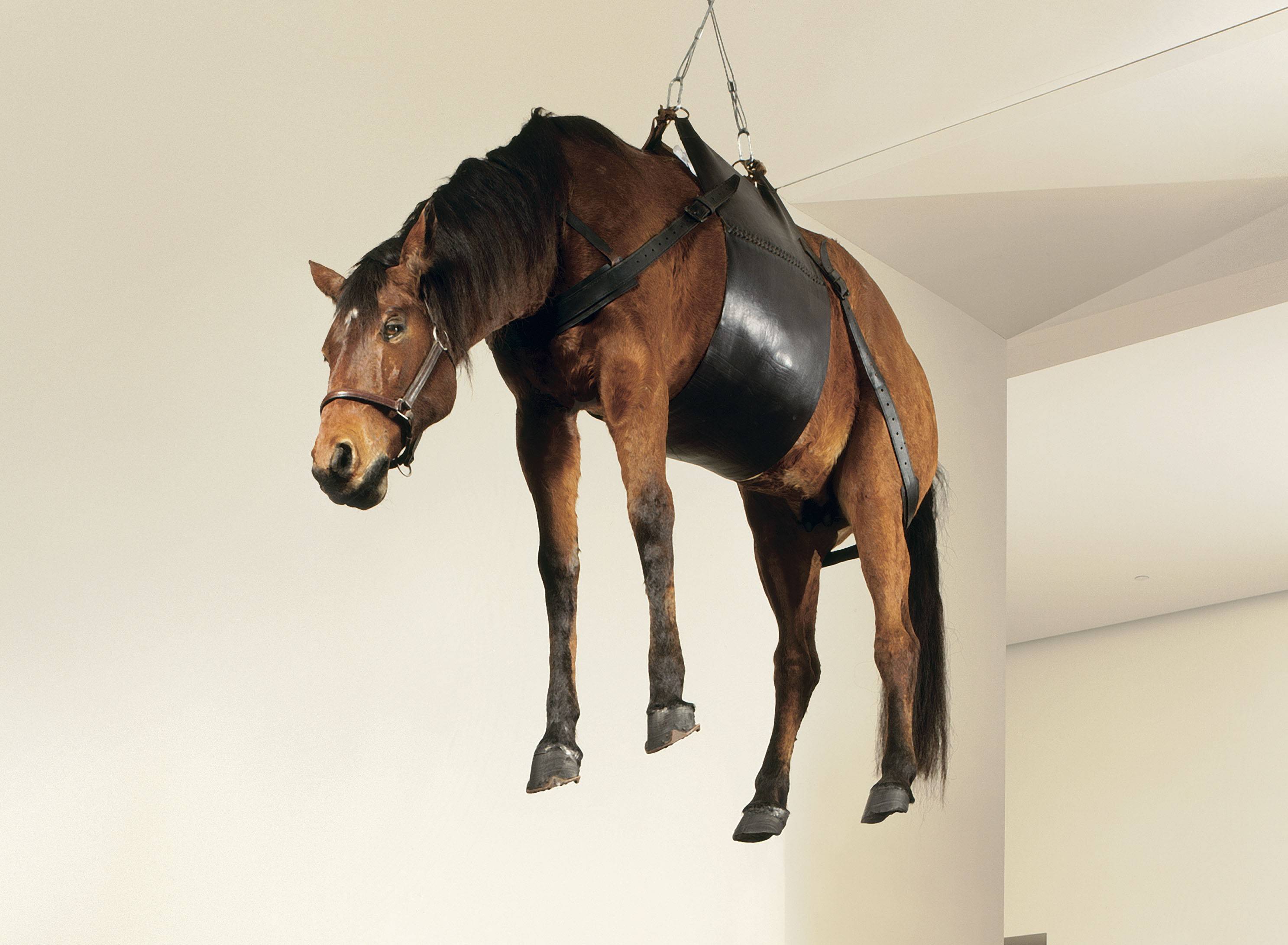 Гвоздь программы, ну, конечно, скульптура Маурицио Каттелана. Нельзя не заметить. На самом авантажном месте. Прямо под потолком холла музея, над белой из мрамора лестницей висит чучело лошади (обещала к теме вернуться). Называние – «Баллада о Троцком», посвящение Льву Троцкому, размышления художника о русской революции. Да и сам Каттелан – не простая «штучка». Художник-самоучка. Вырос в бедной семье уборщицы и водителя грузовика, работал на почте, был поваром, уборщиком, донором банка спермы, работал в морге… идиотизм называет своей исключительной чертой поведения. Сегодня – один из самых, если не самый дорогой из современных в мире. Бернар Арно приобрел «Балладу о Троцком» в 2004 году на аукционе Sotheby’s за $ 2,1 млн.