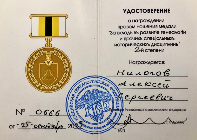 Заведующий лабораторией генеалогических исследований, к. филос. н. Алексей Сергеевич Нилогов награждён медалью 2-й степени "За вклад в развитие генеалогии и прочих специальных исторических дисциплин". Решение о награждении принято Российской генеалогической федерацией (РГФ) 25 сентября 2025 г. Награду А. С. Нилогову вручил президент РГФ, управляющий Герольдией Российского императорского дома, к. и. н. Станислав Владимирович Думин на международном фестивале семейной истории "ГенЭкспо 2025", который проходил в Москве 27-28 сентября.