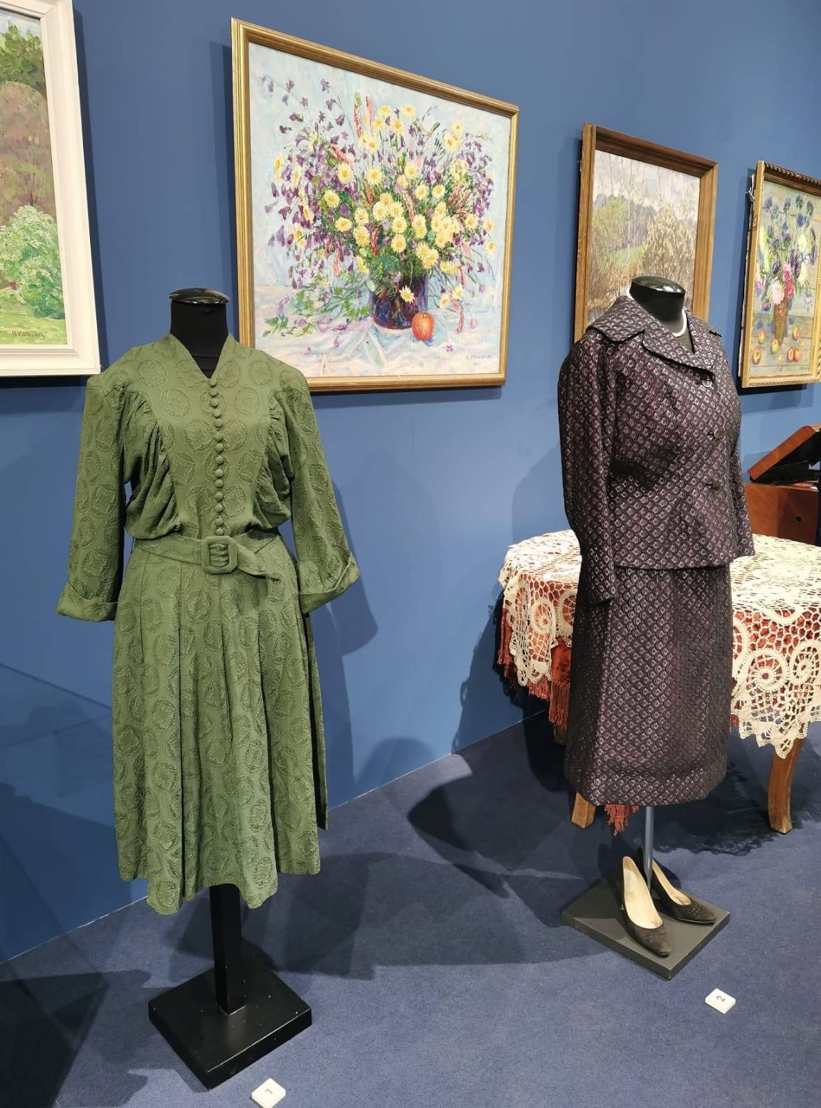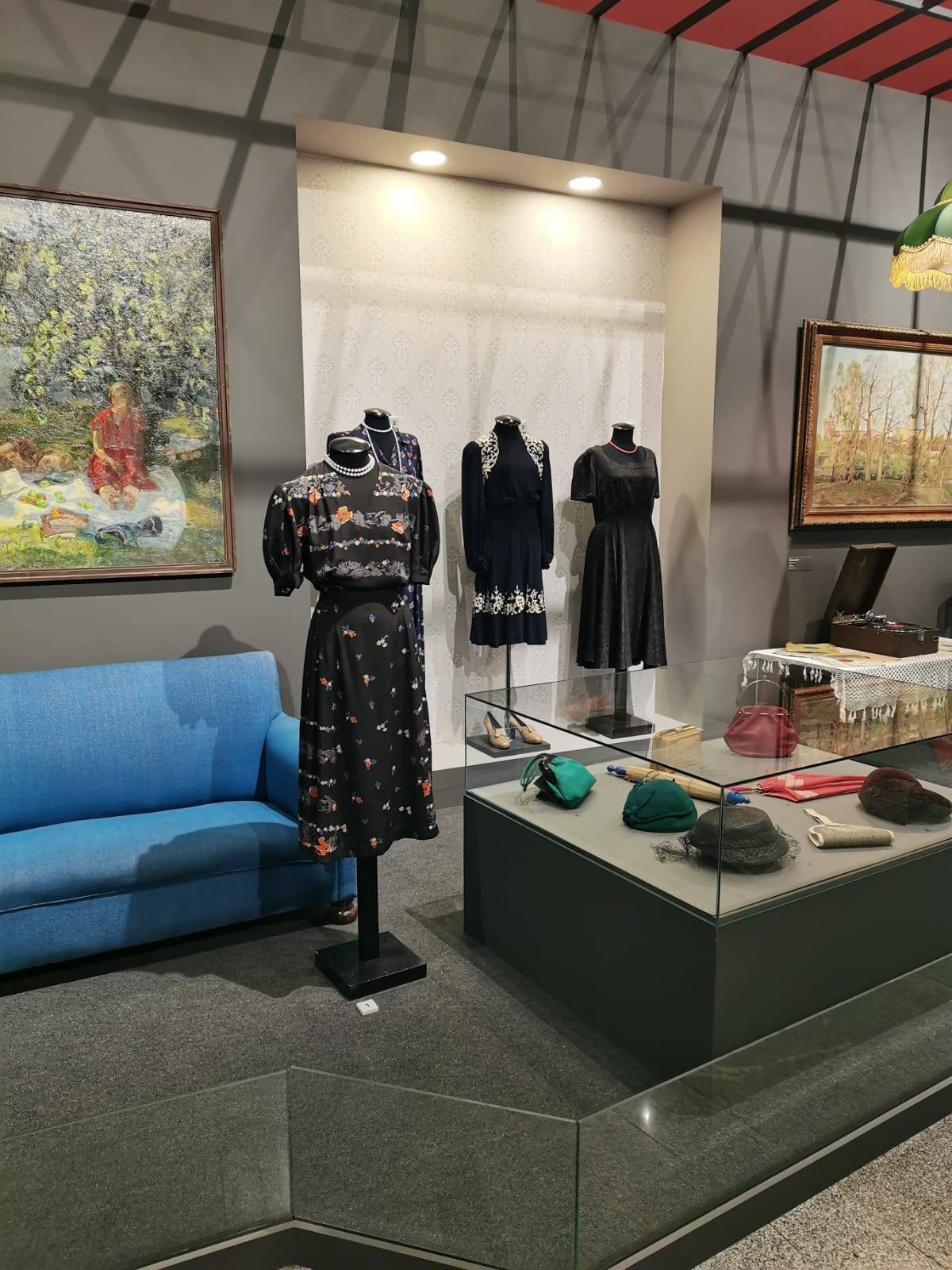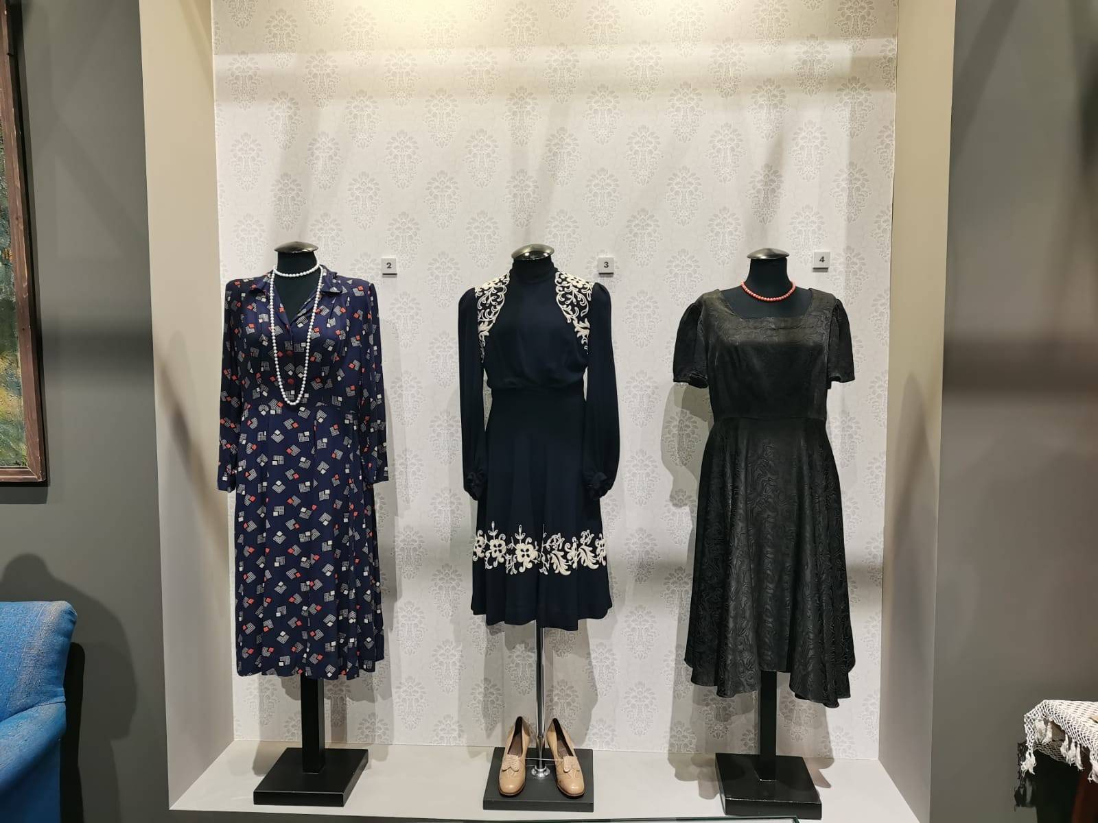 В самом начале представлена женская форма Великой Отечественной войны – с неё-то и начинается путь Победы, её красоты и величия. А потом, как в стихотворении Ярослава Смелякова: «Сняли вы бушлаты и шинели, / старенькие туфельки надели». И – стали шить платья из ситца, крепдешина и панбархата. Перед нами – реконструкция комнаты. Этажерка с книгами, на ней - радиоприёмник «Москвич», шикарное трюмо и на переднем плане – швейная машинка «Зингер» - главная «героиня» повествования.