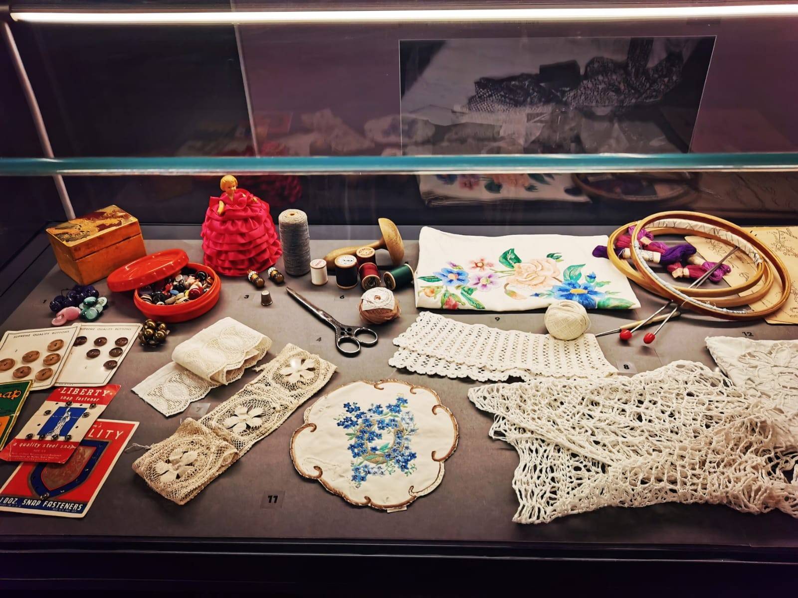 Небольшой стенд посвящён рукоделиям – вязанию, созданию кружев, салфеточек и скатертей, вышиванию на пяльцах. Тут же – произведения мастериц и – журнал мод, в котором, помимо самих фасонов, содержались способы отделки готового платья. Рядом – инсталляция в виде комнаты с пышным матерчатым абажуром, круглым столом и скатертью, вышитой в стиле «ришелье». Едва ли не в каждом приличном доме имелись подобные скатерти! Ещё один стенд – косметика и парфюмы. Изумляют потрясающие флаконы для духов. Далее идут заколки, гребни, зажимы, в том числе и китайского производства. Эта выставка – ещё и воспоминание о былом, словно листаешь страницы коллективной биографии.