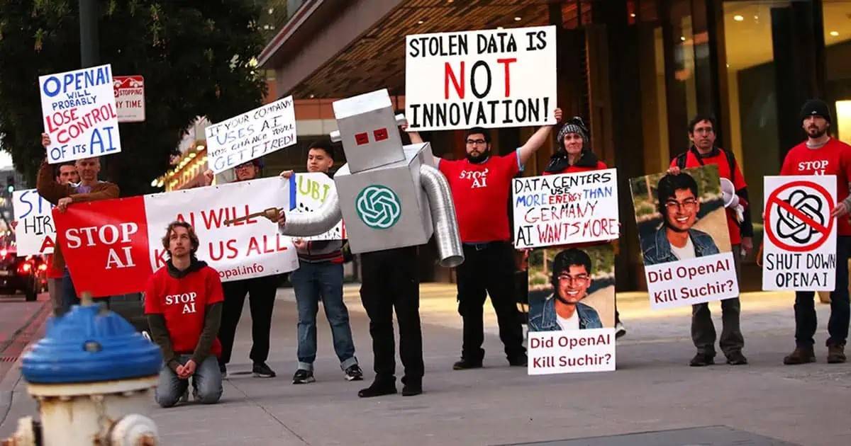 Общественные страхи разрастаются в вакууме. В один из дождливых пятничных дней небольшая группа из примерно 30 протестующих собралась у офиса OpenAI. Среди них были учителя, студенты, специалисты по информатике и профсоюзные деятели. На плакатах с надписью «Остановите ИИ» Альтман был изображён в образе инопланетянина, а также звучали предупреждения: «ИИ крадёт ваш труд, чтобы украсть вашу работу» и «ИИ = климатический коллапс».